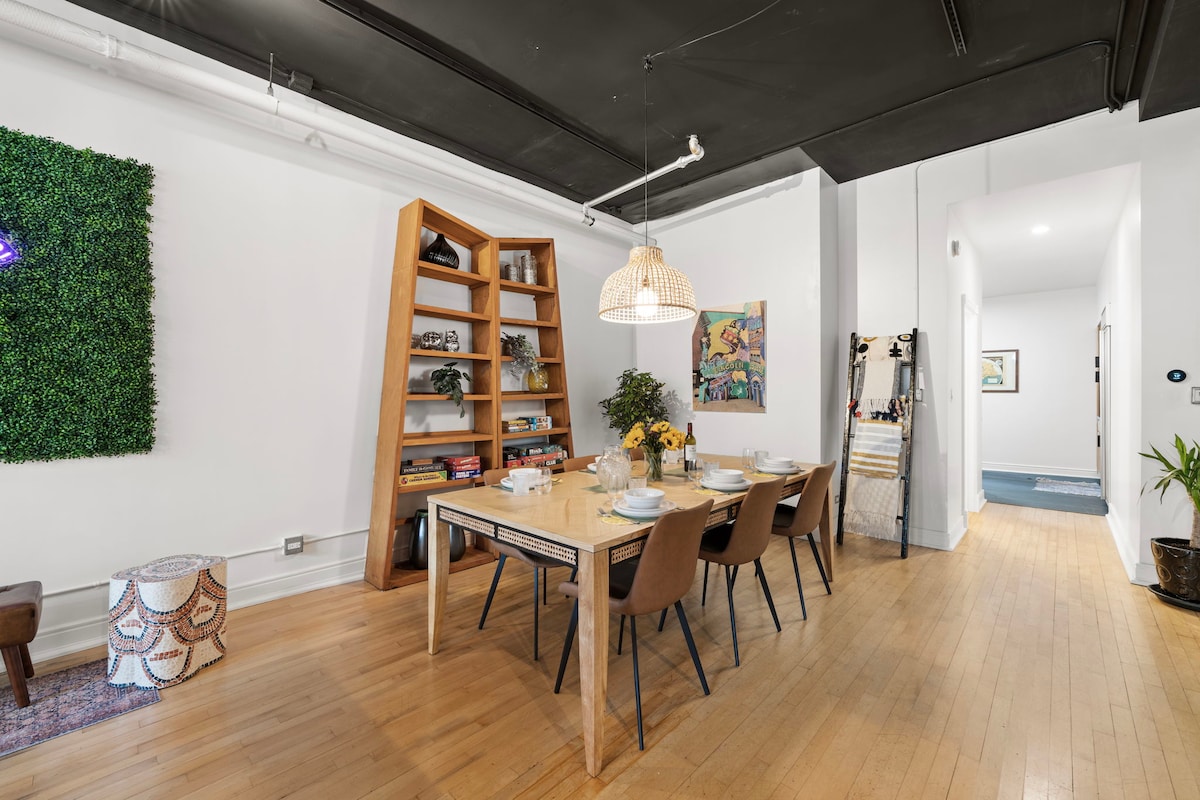 Dok ulazite u svoj privatni stan na 1. spratu iz Western Avea, dočekat će vas zapanjujuća široka sjajna soba. Sa više od10 stopa plafona, ovaj prethodno komercijalni prostor pruža dovoljno uživanja za cijelu grupu. Dodajte elegantan boho dizajn i ovaj Airbnb je jedinstven! Uživajte u svim sadržajima od kuće, potpuno opremljenoj kuhinji, velikom trpezarijskom stolu, igrama (uključujući stoni fudbal), udobnim krevetima i sjedećim mjestima i još mnogo toga. Sve u prekrasnom i ugodnom Lincoln Squareu!