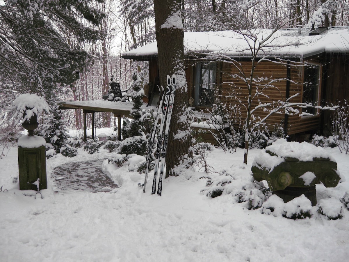a secluded hilltop retreat on 5 woodsy, landscaped acres; wood stove for cold-weather fires; large deck with gas grill; x-treme tennis court* with pavilion and fire ring; walking trails, many also suitable for cross-country-skiing**; well-behaved pets negotiable note: parties and events are not allowed * cracked surface adds a challenge (think Wimbledon meets Whack-a-Mole) ** (and, if you take certain trails, downhill skiing)