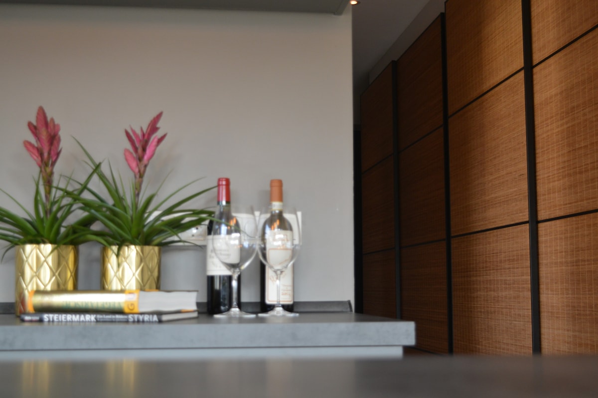Ovaj prostrani smještaj u kući arhitekte očarava prije svega otvorenim svijetlim podom s velikom krovnom terasom i slobodnim, otvorenim i rotirajućim kaminom od 360 stepeni. Prednja strana prozora se može u potpunosti otvoriti. Prefinjena kuhinja ima mašinu za nošenje filtera i Bora Professional sistem s Teppanom. Sistem surround zvuka pruža poseban doživljaj zvuka. Na drugom spratu su tri spavaće sobe i kupatila i otvoreni salon.