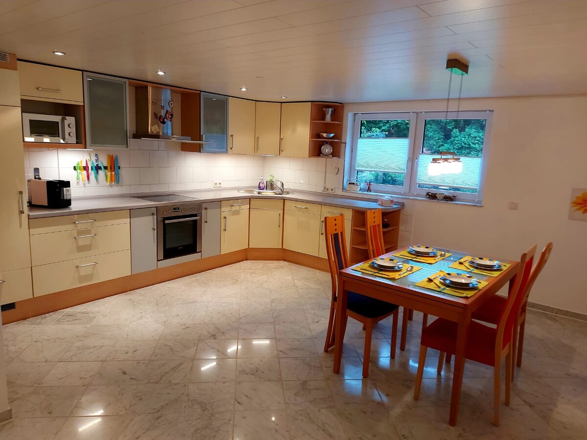 Naš stan nudi dovoljno prostora za cijelu porodicu. Na zahtjev obezbjeđujemo opremu za bebe (dodatni krevet i stolicu za hranjenje). Uživajte u miru i tišini u velikoj kadi s dobrom knjigom ili plešite pod kišnim tušem. U potpuno opremljenoj kuhinji možete dočarati ukusna jela i biti zajedno. Možete se opustiti na udobnom kauču koji se uskoro pretvara u krevet. Terasa vas poziva da se sunčate.