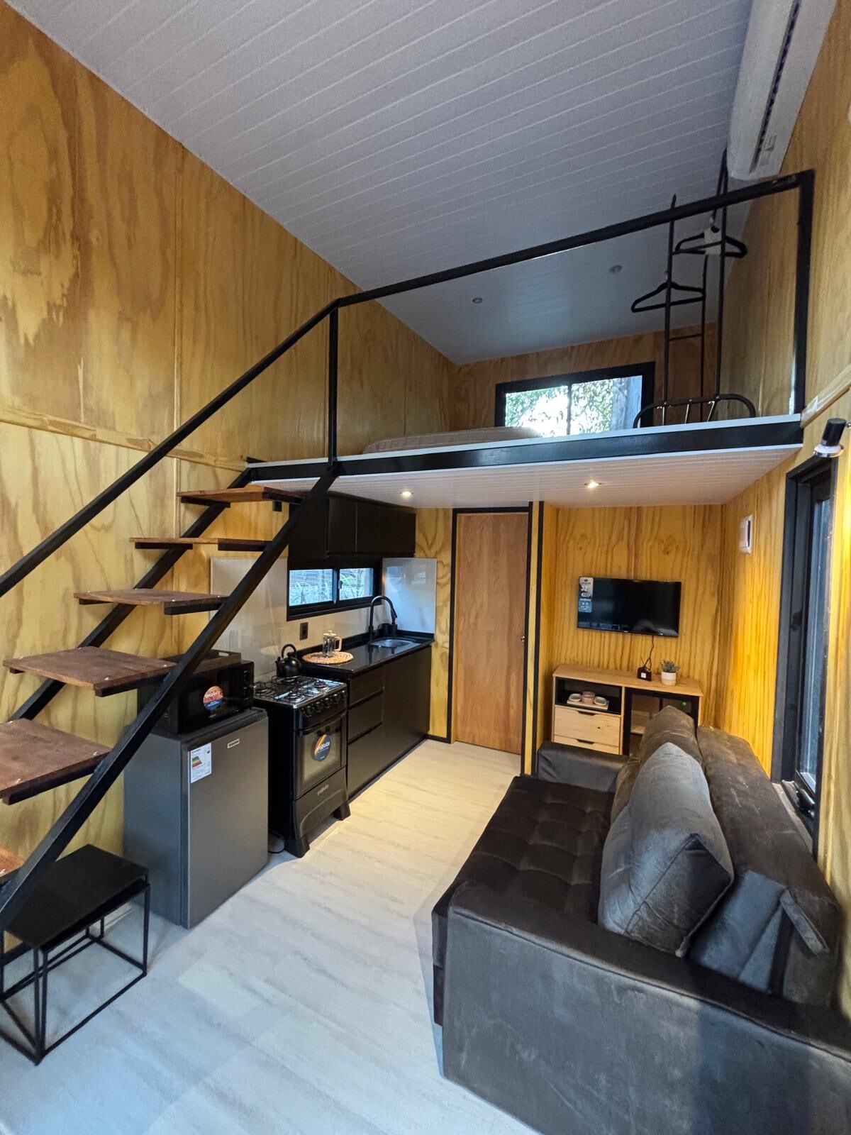 Casitas_del_ensueno: Cabaña a solo 50m. de la playa y rodeada de bosque nativo. En plena naturaleza, está construida con materiales cálidos y de diseño, aberturas doble vidrio, estufa a leña. Amplio espacio abierto con vista al bosque, living-cocina con todo para 4 huéspedes (max. 3 adultos), 1 dormitorio en suite con salida al deck, 2do dormitorio con cama nido (twin) y 2do baño. Wifi por FibraOptica. Pura luz y bosque a un paso del río. Estacionamiento, parrillero, TV, hamaca, sillas de playa.