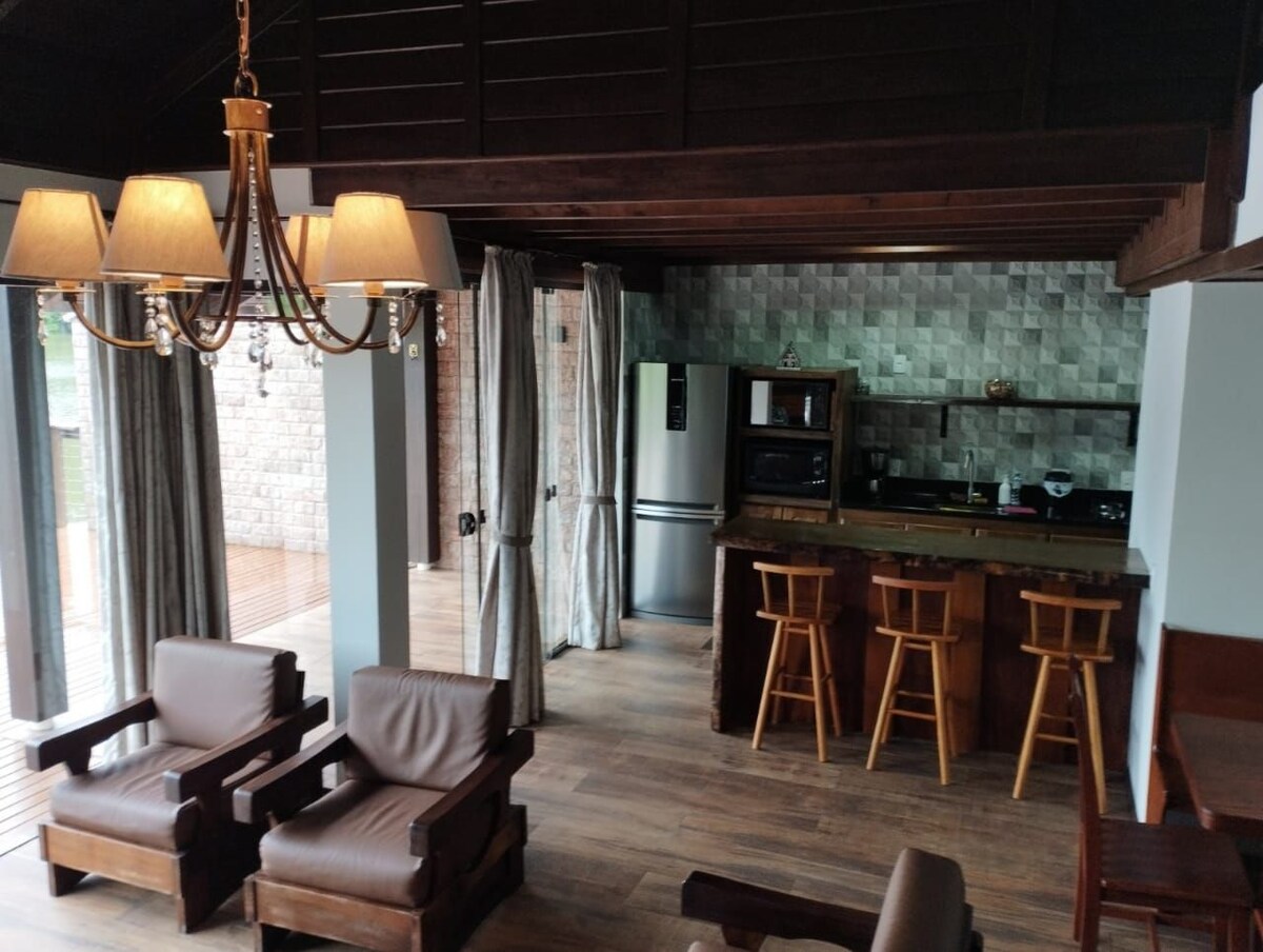 Vrlo udobna brvnara, u centru Doutor Pedrinha, s jednostavnim pristupom svim prirodnim ljepotama opštine. Njegova povlaštena lokacija, na vrhu brda, pruža najljepši pogled na grad. Dizajniran je s obilnom upotrebom stakla za promovisanje uranjanje u prirodu oko njega. Ima kamin i ofurô s hidromasažom za potpuno opuštanje gostiju. Pružamo svu osnovnu opremu za ugodan boravak. Idealno za odmor i uživanje u bujnom krajoliku ovog područja!