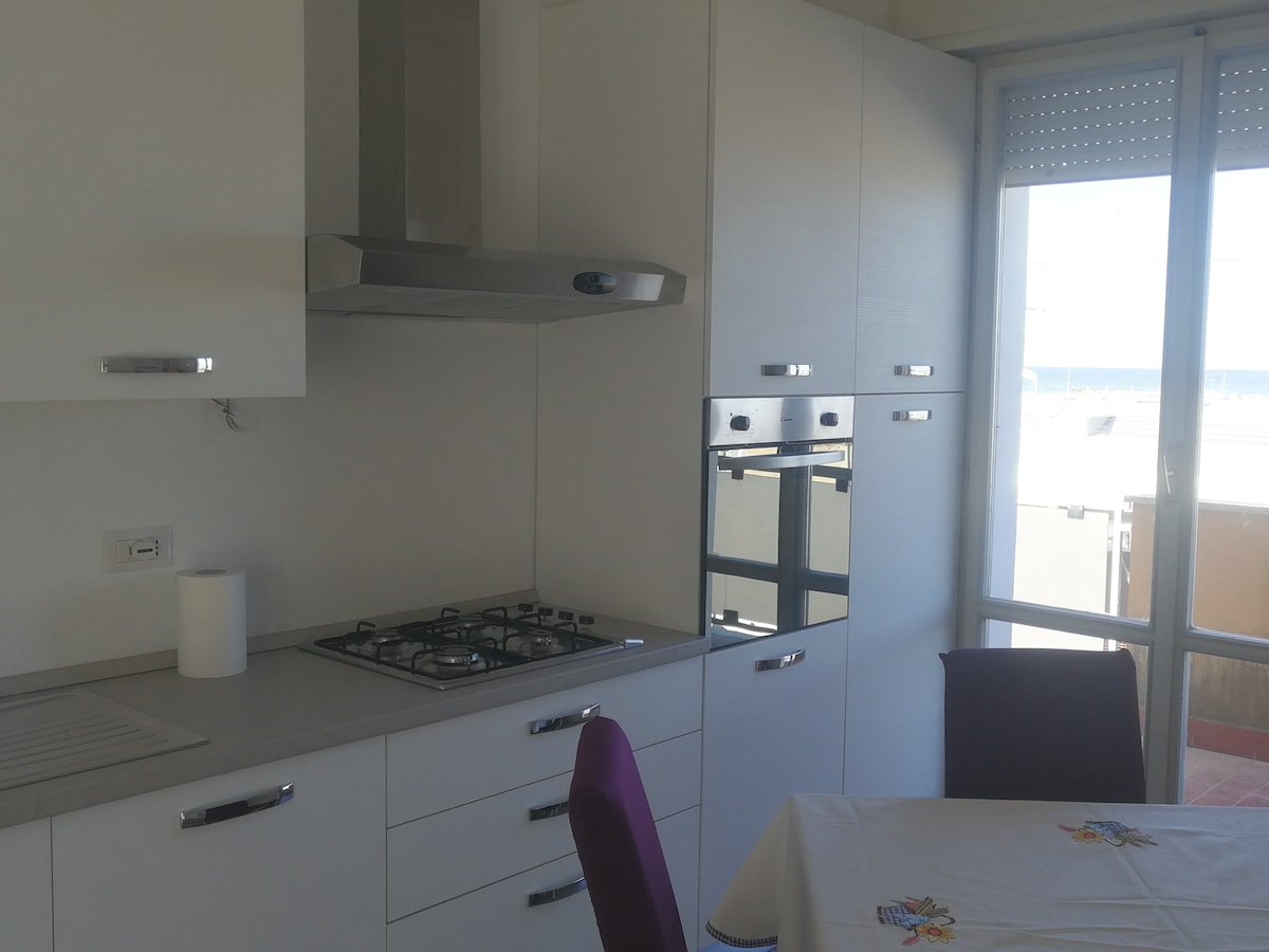 Stan sa zadivljujućim pogledom na more, nedavno renoviran na obali Riminija, samo 10 m od plaže. Elegantan dnevni boravak, spavaća soba s bračnim krevetom, kuhinja opremljena pločom za kuhanje, posuđem, priborom za jelo, loncima, frižiderom i trpezarijskim stolom. Nezavisni klima uređaj u dnevnom boravku i spavaćoj sobi, električne roletne, ultrabrzi Wi-Fi, Smart TV u svakoj sobi, radni stol, sef, veliko kupatilo s prozorom, hidromasažna tuš kabina, Bluetooth ogledalo za muziku i fen za kosu.