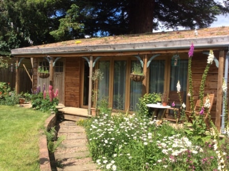 The Painter’s Cabin is an ideal getaway for couples or singles alike. Recently built, cozy, non-smoking space, perfect for a retreat or a calm escape. The Painter’s Cabin, situated on a quiet backroad, offers a relaxed luminous space overlooking a lovely green garden with a view of Totnes castle and the distant Dartmoor hills. No need for a car, this spacious retreat is only a five-minute walk from the town center and the iconic river Dart with its walks to Sharpham and Dartington estates.