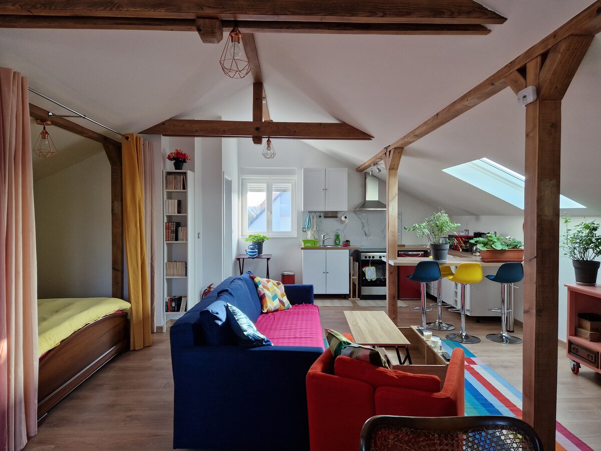 Sous le toit, espace spacieux, lumineux, calme et indépendant au deuxième étage d'une maison de caractère. Deux grands Vélux vous offrent une vue imprenable sur les Vosges. La location comprend la pièce principale, une chambre attenante avec un lit double, une salle de bain, une petite cuisine et une mezzanine avec 2 matelas posés sur des tatamis. La restauration a été réalisée avec des matériaux écologiques... et avec beaucoup de soin et d'amour! Vous avez accès au jardin à votre guise!