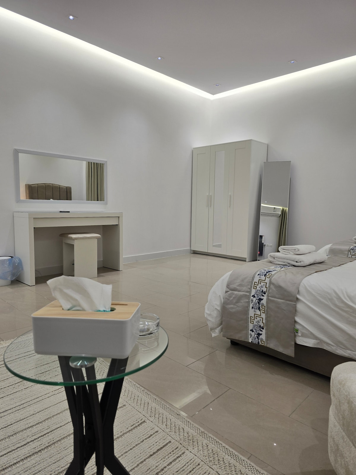 Uživajte u mirnom boravku u privatnom studiju koji se sastoji od spavaće sobe i kupatila, s glavnim krevetom i bočnim sjedištem. Usluge: - Pametni TV nosači. - Brz i besplatan internet. - Samostalni dolazak i visoka privatnost. Lokacija: Nalazi se na sjeveru Rijada, u blizini sezonskih događaja u Rijadu.