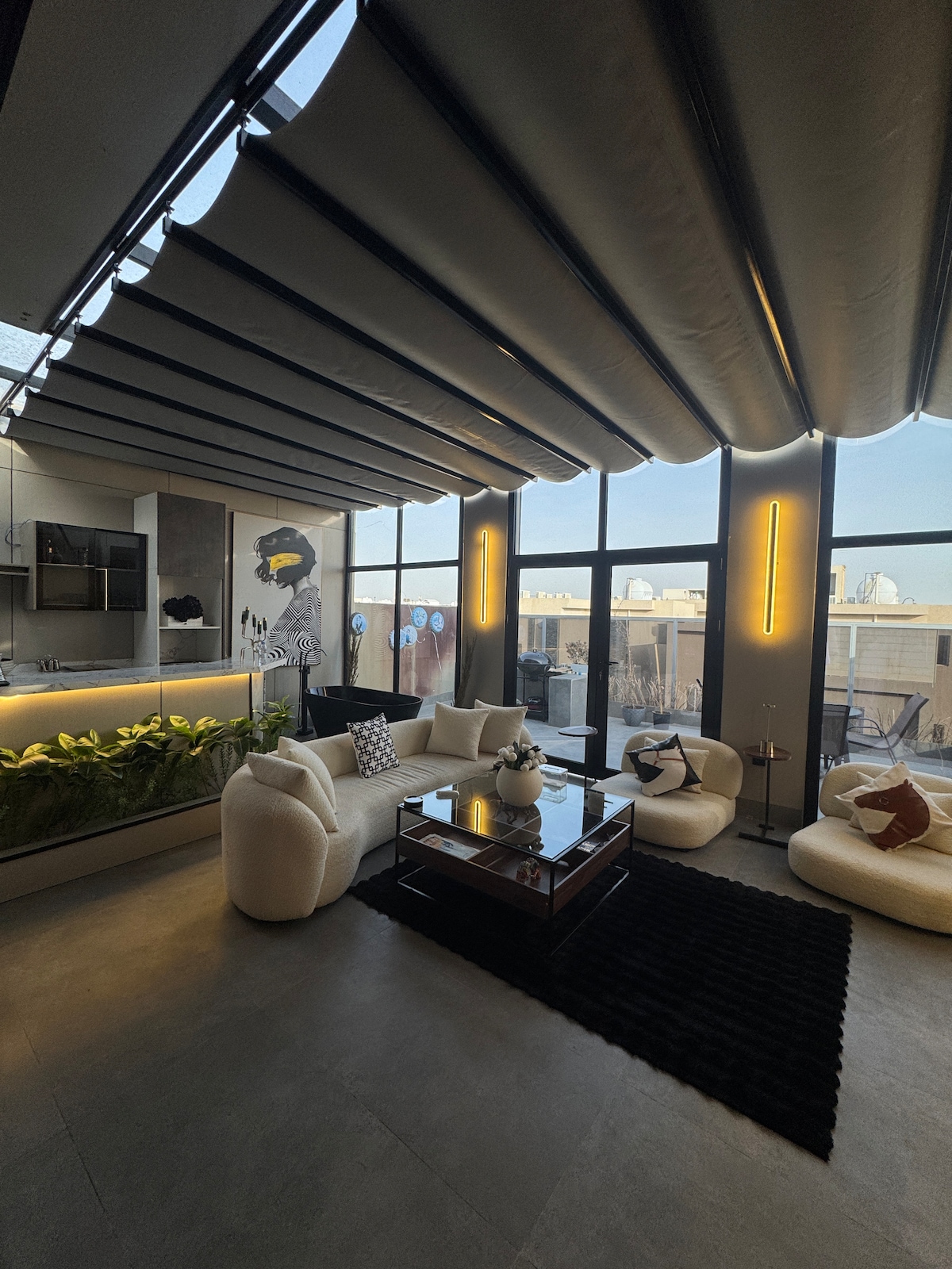 A modern apartment designed for an exceptional stay, located in one of Riyadh’s finest neighborhoods with a stunning view of KAFD. It features an outdoor seating area with a screen and projector for enjoyable evenings. For your comfort, the bed includes a high-quality 14cm extra layer. “We also offer event coordination services for special occasions (including cake and accessories) for an additional fee with prior booking, ensuring an unforgettable experience “