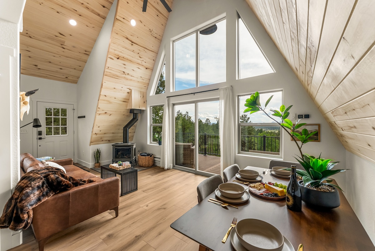 ⊠Newly built modern A-frame (750 sq ft) in the Pikes Peak Region ⊠Two cozy bedrooms (including loft) ⊠Luxurious private jetted hot tub ⊠Stargazing dome ⊠Picturesque wooded lot w/ serene views ⊠Easy access to the Fossil Beds, three state parks, national forest, hiking, gold-medal fly fishing, & much more ⊠Large deck w/ gas fire pit, cushioned Adirondack seating, & outdoor dining ⊠Indoor gas fireplace ⊠Full kitchen w/ coffee & tea bar ⊠Weber BBQ grill ⊠Pet friendly (one dog max.)