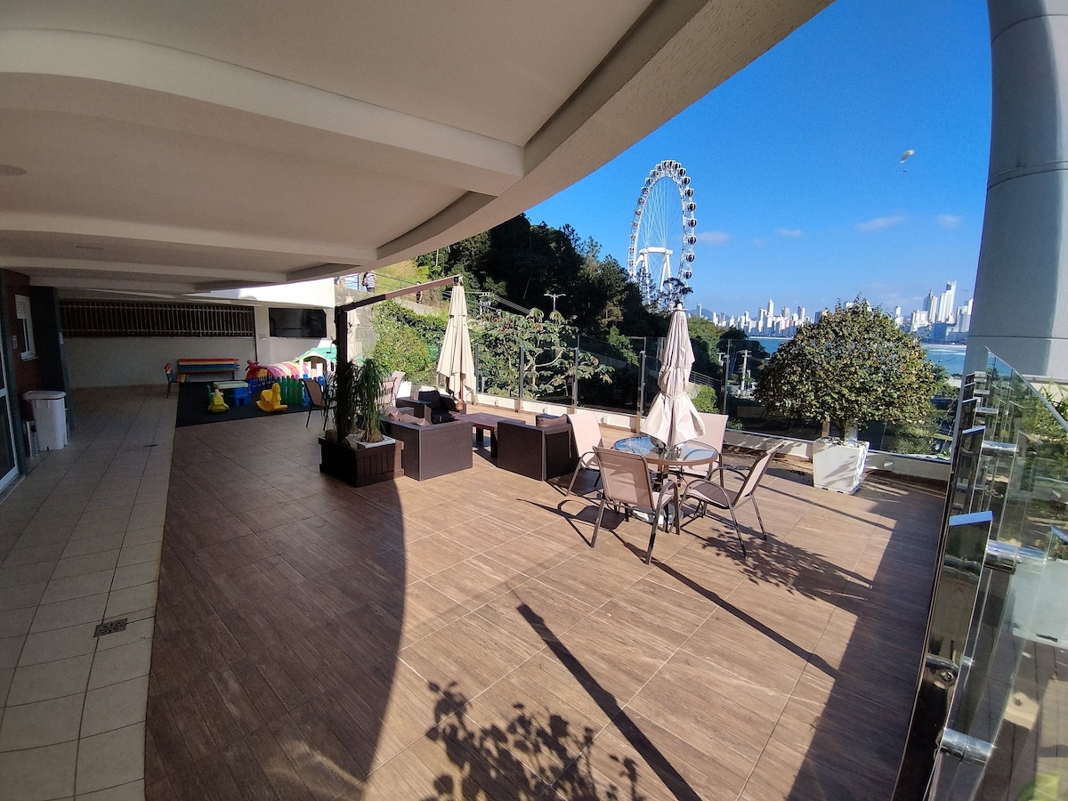 Apt with the best view of Balneário Camboriú, to the sea (front and total view of all the waterfront), to the forest next door (with trails), to the condominium pool (accessible to guests). You will be in a difficult choice to be dazzled and delighted! Oh, and still has the very well equipped apt, with everything new: 32 inch TV. Smart, Wi-fi, refrigerator two doors, air conditioning, stove, microwave, sofa bed, hair dryer, iron, etc. And with garage. I doubt the best value for money