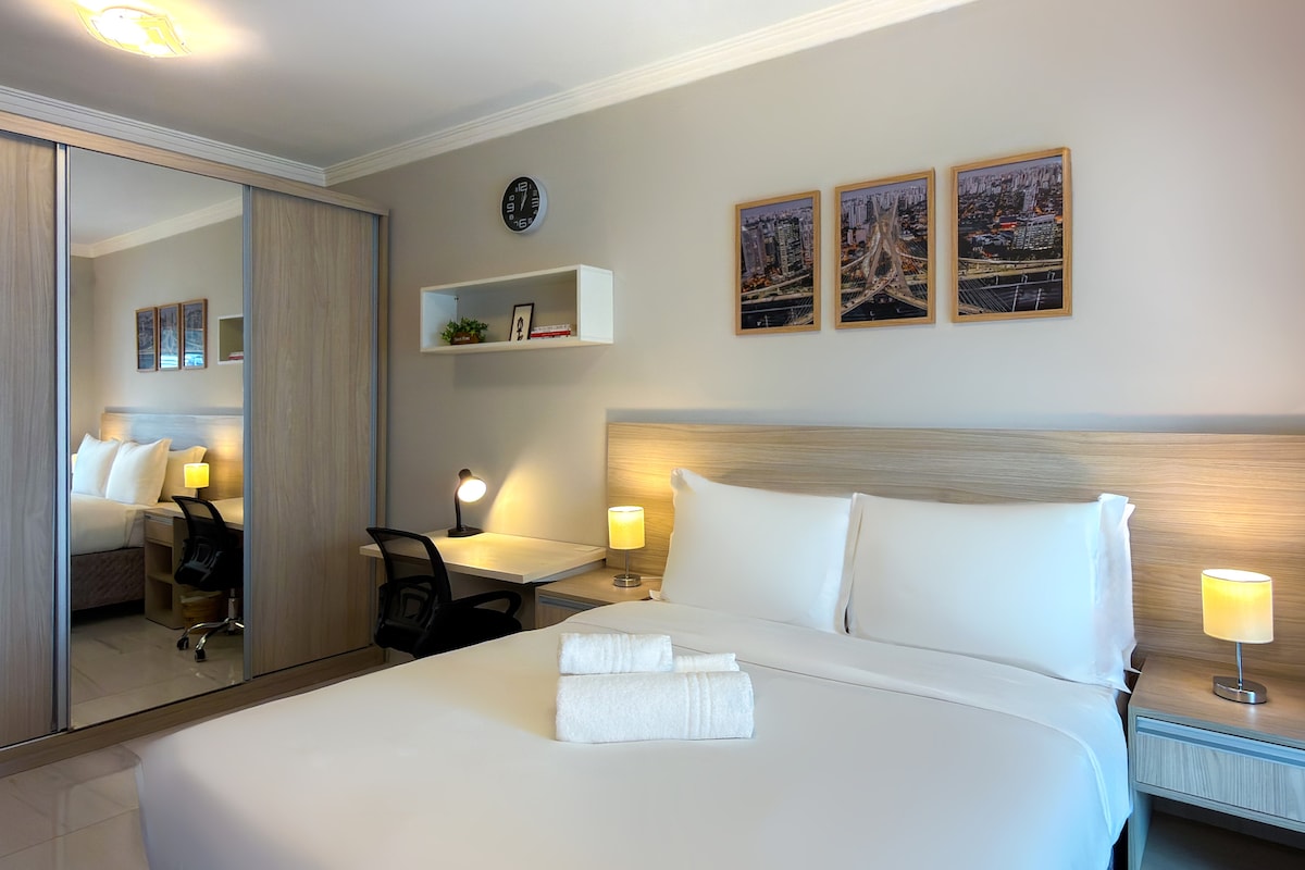 Moderan i udoban studio, balkon, kompaktna kuhinja, klima-uređaj, Smart TV, kao i mnogi drugi sadržaji. Nalazi se 300 m od stanice metroa Anhangabaú i 500 m od stanice República. Imajte sigurnost kondominija s recepcionerom koji radi 24 sata dnevno. Gostima su na raspolaganju bazen, teretana i soba za sastanke. Samostalni dolazak ! Gosti dobijaju lozinku (elektronska brava) na dan dolaska.
