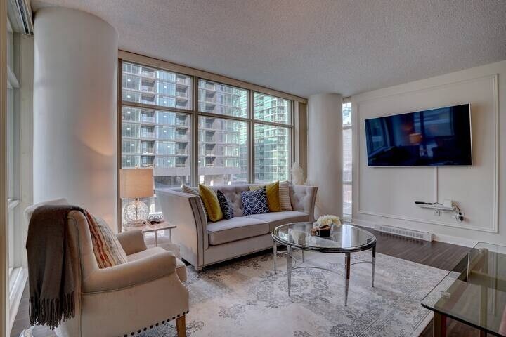 Zamislite da se probudite uz prekrasan prizor CN tornja koji prodire horizont, njegov odraz koji pleše na jezeru Ontario. Nakon cjelodnevnog istraživanja živahnih ulica Toronta i posjeta znamenitostima kao što su Rogers Centre, Scotiabank Centre i čarobni Ripley's Aquarium, opustite se u dnevnom boravku s panoramskim pogledom ili prošetajte do obližnjih restorana i noćnog života. Opremljen osnovnim priborom za kuhanje i objedovanje, peškirima, posteljinom i osnovnom opremom za kupanje. Gledajte svoju omiljenu emisiju na pametnom TV-u.