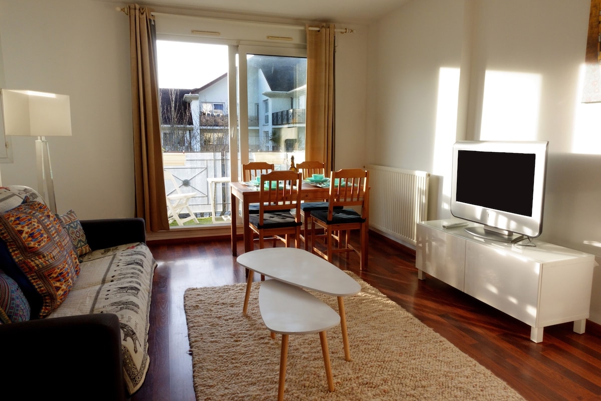 Uživajte u elegantnom smještaju u centru VERDEA na gornjem spratu! Idealno smješten, stan 100 metara od RER A za vaša direktna putovanja u Pariz i Disneyland. Vrlo lijepe dvije sobe pogodne za 4 osobe, koje nude kvalitetne usluge i elegantan i uredan ukras. Prodavnice u podnožju vašeg prebivališta omogućit će vam da u potpunosti uživate u boravku za porodice, parove ili grupe prijatelja. Stan također ima privatno parking mjesto.