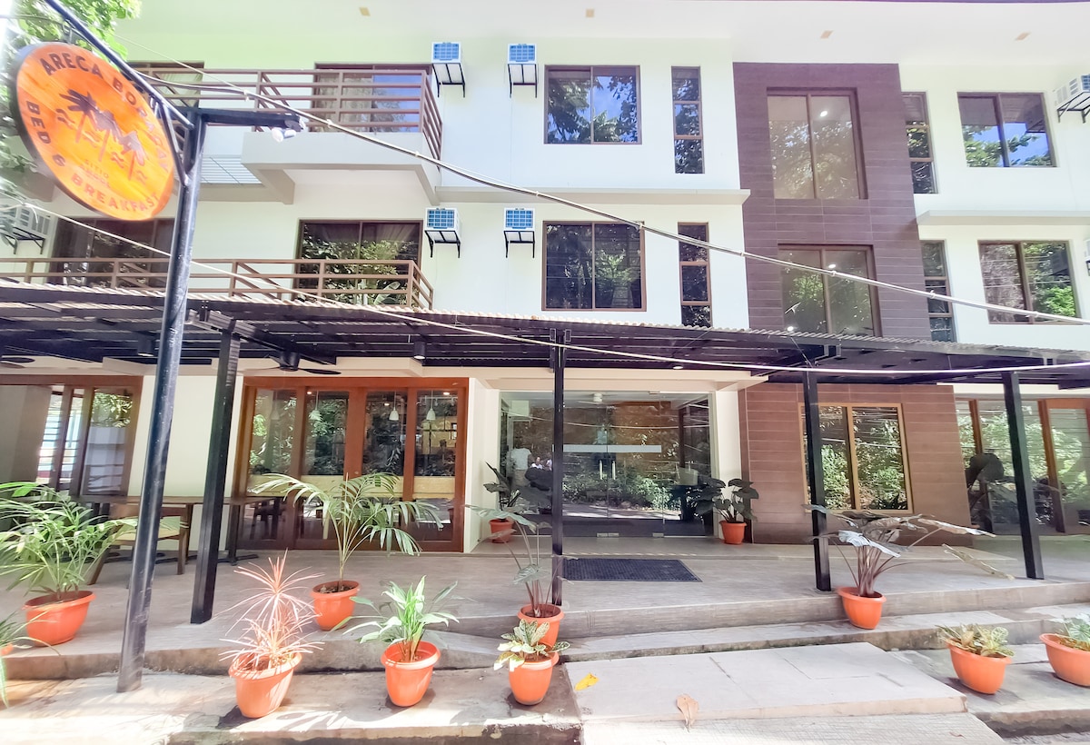 Areca Bed and Breakfast is an oasis that has 10-12 cozy rooms situated in a quiet area in Angol road just a a minute walk to the beach. The structure has a clean, contemporary design with widows, large sliding glass doors and balconies on the upper floors. The facade is pointed in light colors with some contrasting darker wooden sections. Habagat PROMO: Oct 1- Nov 15 ( ROOM only ). Guests can pay an additional Php 250/ person/breakfast