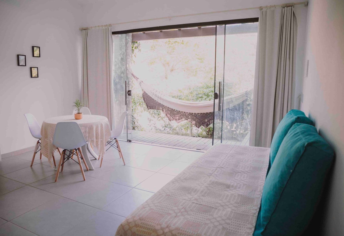 Širok, udoban, privatan, individualni pristup Idealno za mladi par ili 4 osobe, dobro za život 5 minuta od plaže automobilom (2 km); 1 km od centra. Mirno mjesto, siguran i jednostavan pristup Rosi i drugim plažama u regiji. - Queen s bračnim krevetom (širine 150-179 cm) i klima-uređajem Q i F -Sala com TV 32 Smart, bicama p/ 2 singla, ventilator Ukusan butik s visećom ležaljkom i prekrasnim pogledom na planine - Kompletna i funkcionalna kuhinja -Gardin i prostor za roštilj (uobičajena upotreba) - Wi-Fi stabilna vlakna od 100 MB
