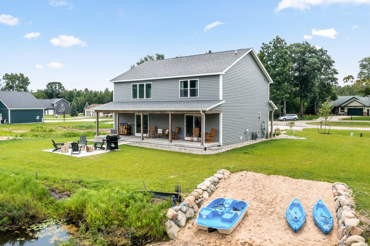 Na mirnom kanalu, nekoliko minuta od glavnog jezera. Također, samo 8 minuta do kristalno čistog jezera Higgins! Još uvijek ima miris nove kuće! ★3 luksuzna bračna kreveta (1 prvi sprat) ★Pristanište ★Krevet na sprat s punim krevetom, bračni krevet + krevet za jednu osobu ★ Lux bračni krevet za spavanje ★Ognjište sa drvetom ★ Potpuno napunjen kafić sa svime što je obezbijeđeno ★ Igre+igračke za sve uzraste ★ Zaštitna ograda za bebe, stolica za hranjenje, mašina za spavanje ★ 5 BurnerGrill s propanom ★ 2 kajaka+ pedalina ★ Štapovi za ribolov + igre na otvorenom ★ Vanjska garnitura za sjedenje Područje ★ uz plažu