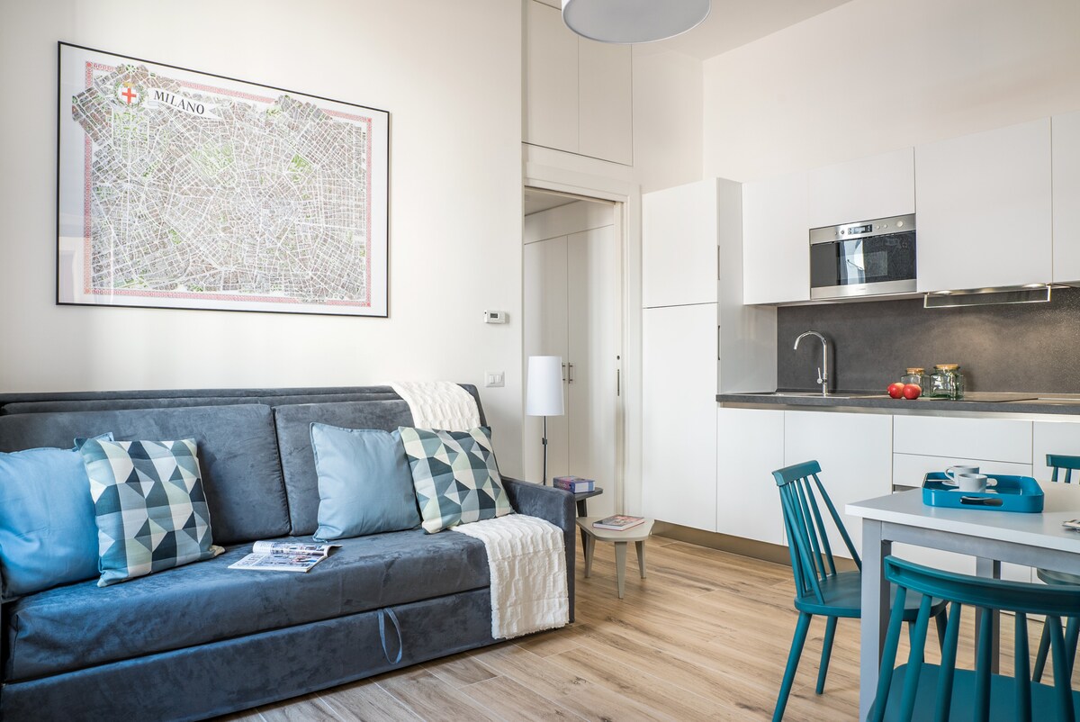 Veliki i elegantni stan u drevnoj dvorišnoj kući u historijskom centru, vrlo blizu metroa Moscova. Stan ima udoban dnevni boravak s kuhinjom, trpezarijskim stolom i kupatilom sa sicilijanskom keramikom. Veliki luk odvaja spavaću sobu s prekrasnim pogledom na crkvu S. Maria Incoronata. Odlikuje se visokim plafonima, podom od terakote s kraja 19. vijeka, ugodnim kutkom s kaminom i malim privatnim unutrašnjim dvorištem. Ovdje možete udahnuti okus starog Milana.