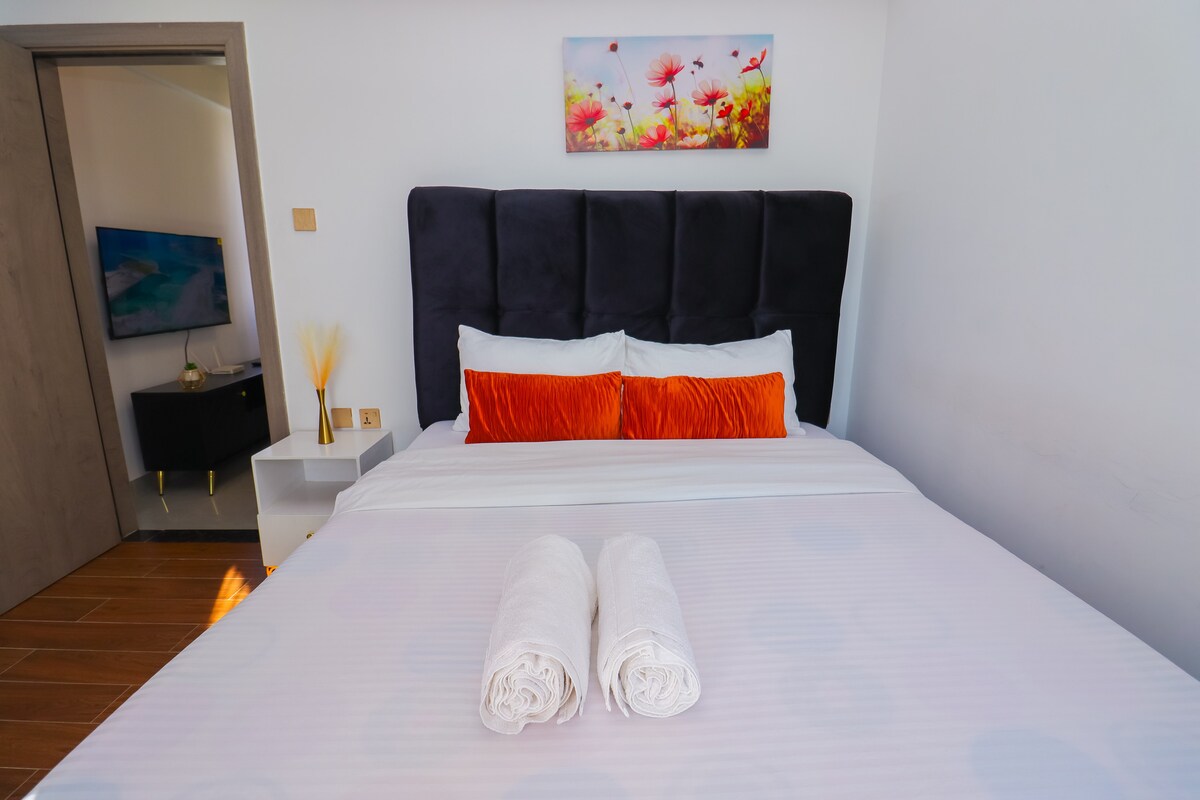 Ako odaberete čistu i urednu energiju, pronaći ćete ovu stambenu jedinicu opremljenu za najzahtjevnije goste. Stambeni prostor prikazuje minimalizam s tonskim stilom kako bi upotpunio savremeni dekor s nagovještajem japanskog Wabi Sabi stila. Boje su spokojne i neutralne, a udobnost je standard. Stakleni fasadni prozori od zida do zida preplavljuju prostor prirodnim svjetlom (i toplinom). Želite li siestu? Napomena : Teretana i bazen se plaćaju za goste koji borave +30 dana