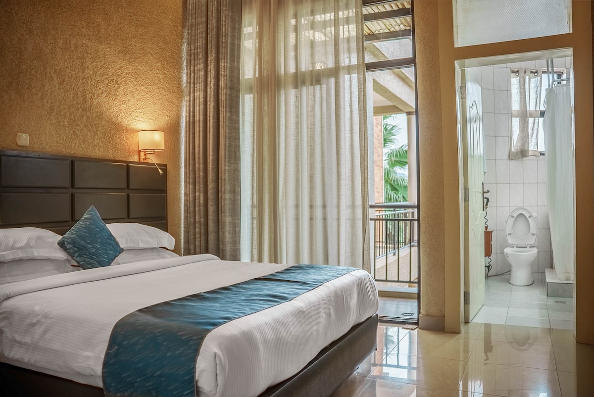 Enjoy a spacious Executive Suite at Amata n’Ubuki Boutique Hotel in Kigali. The suite features a luxurious double bed, air conditioning, fast Wi-Fi, smart TV, sitting area with coffee table, work desk, minibar, mini fridge, safe box and coffee & tea station. Step onto the private balcony with beautiful city and garden views. Guests also enjoy access to the swimming pool, dining area and relaxing lounge spaces. Airport pickup can be arranged upon request.