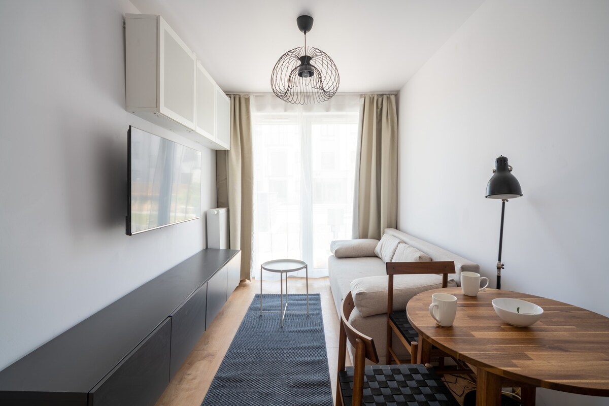 Moderan stan visokog standarda, savršen za parove (do 2 osobe). Blizu centra, sa veoma dobrom saobraćajnom povezanošću – u neposrednoj blizini se nalaze autobuska i tramvajska stanica. Stan se nalazi u zgradi iz 1970-ih, smještenoj u mirnom stambenom području, oko 1,5 km hoda od Starog grada. Prostor se nalazi na drugom spratu zgrade opremljene liftom. U tom području ima dovoljno besplatnog parkinga.
