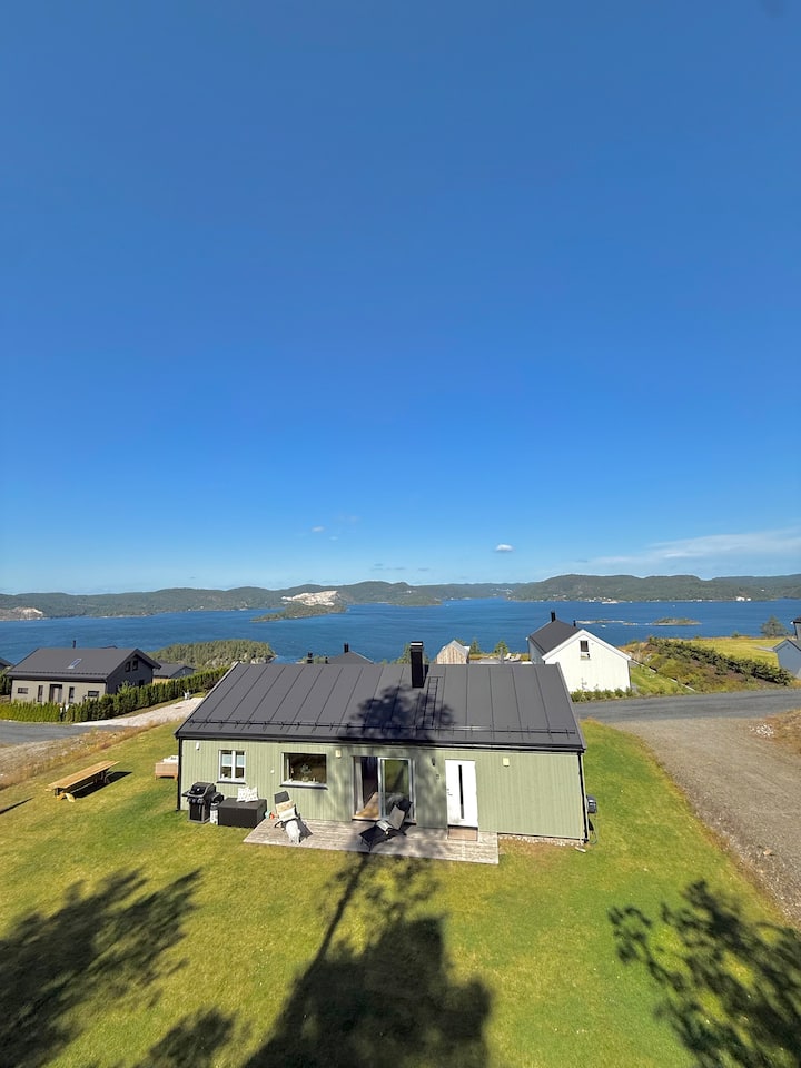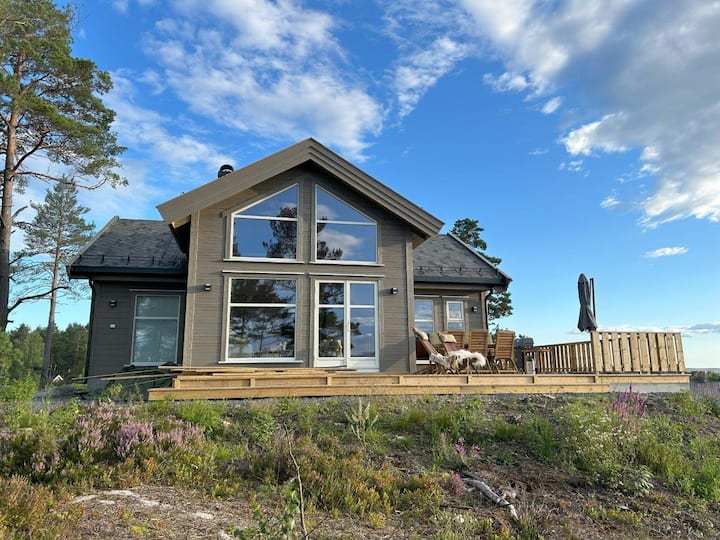 Moderna brvnara u fjordu s panoramskim pogledom, terasom i pristaništem