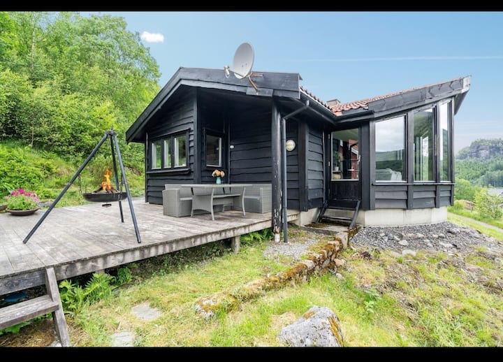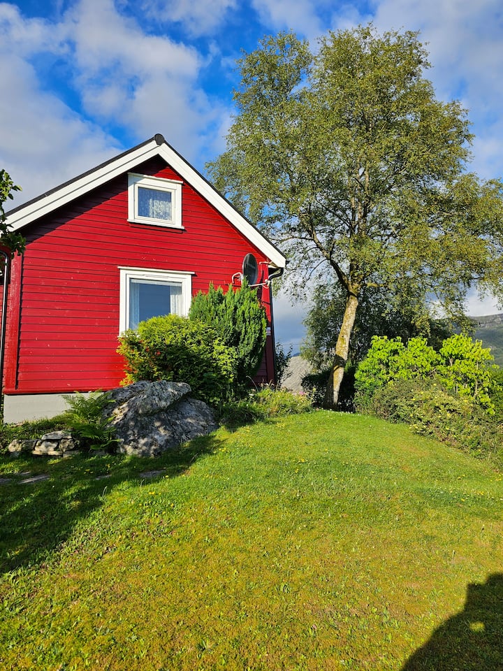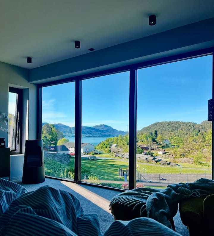Novoizgrađena seoska kućica tokom cijele godine s pogledom na fjordove i planine