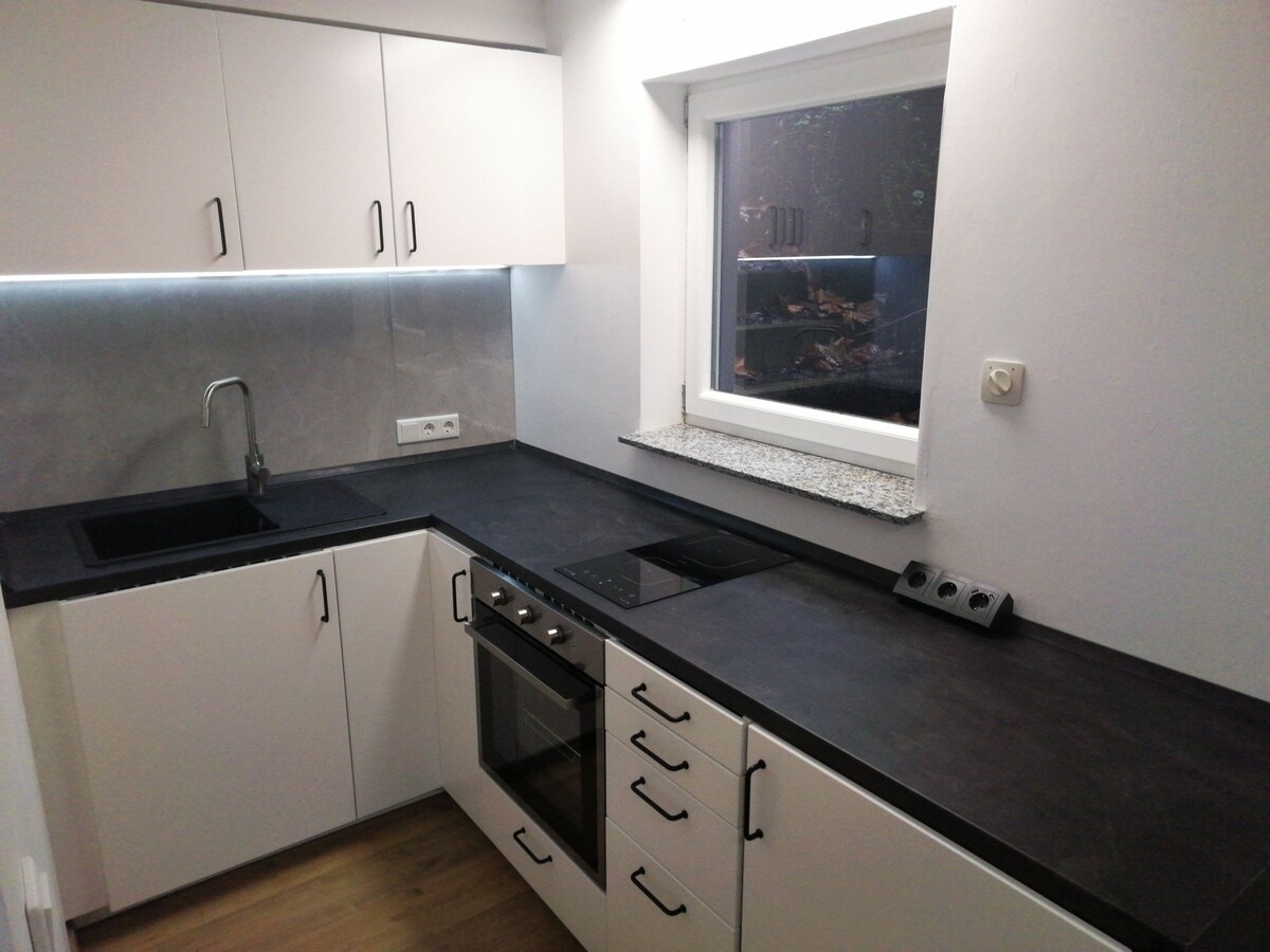 Our freshly renovated (early 2025), bright basement apartment is close to the city, yet right on the edge of nature. Tucked away at the end of a quiet cul-de-sac on a hill (approx. 75 m elevation), it’s cool in summer, calm, and cozy year-round. The 25 sqm space includes a bedroom with kitchenette, a small bathroom with shower, and a south-facing window overlooking our natural garden. We live upstairs with our two young kids (4 & 6) and are happy to help with tips during your stay!