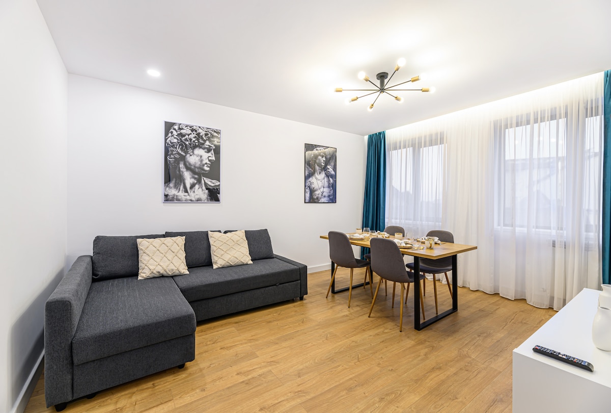 Reasons to choose KOA | Pandora Apartments: • Fully equipped kitchen • Netflix account • Walk-in shower • Complimentary Coffee & Tea KOA | Pandora Apartments is the perfect choice for business travel, families with children, couples, and groups of friends. It is located near the central train station in Brasov. Our location is excellent for a trip in any season, shopping, walks around the city, a surprise for dear ones, spending your free time in peace, or practicing sports.