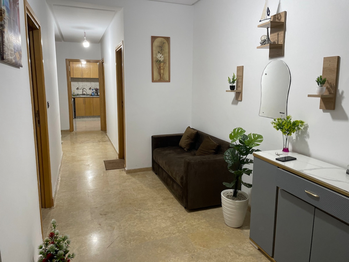 Bel Appartement lumineuse spacieux, neuf 100 m avec ascenseur en 3ème étage . Appartement au centre ville. 5 mns de la plage et Sidi bouzid. 5 mns à pied de Marjane Market.Super Cafe et Restaurant juste en face a pieds. Proches de tous les nécessaires. 1 grand Sallon modern +2 chambre de nuit+ Un séjour+ 1 toilette isolé + 1 Salle de bain :douche et toilette. grande cuisine équipée .wifi .machine à laver neuf,eau chaude et sous sol pour voiture privé/ Gratuit