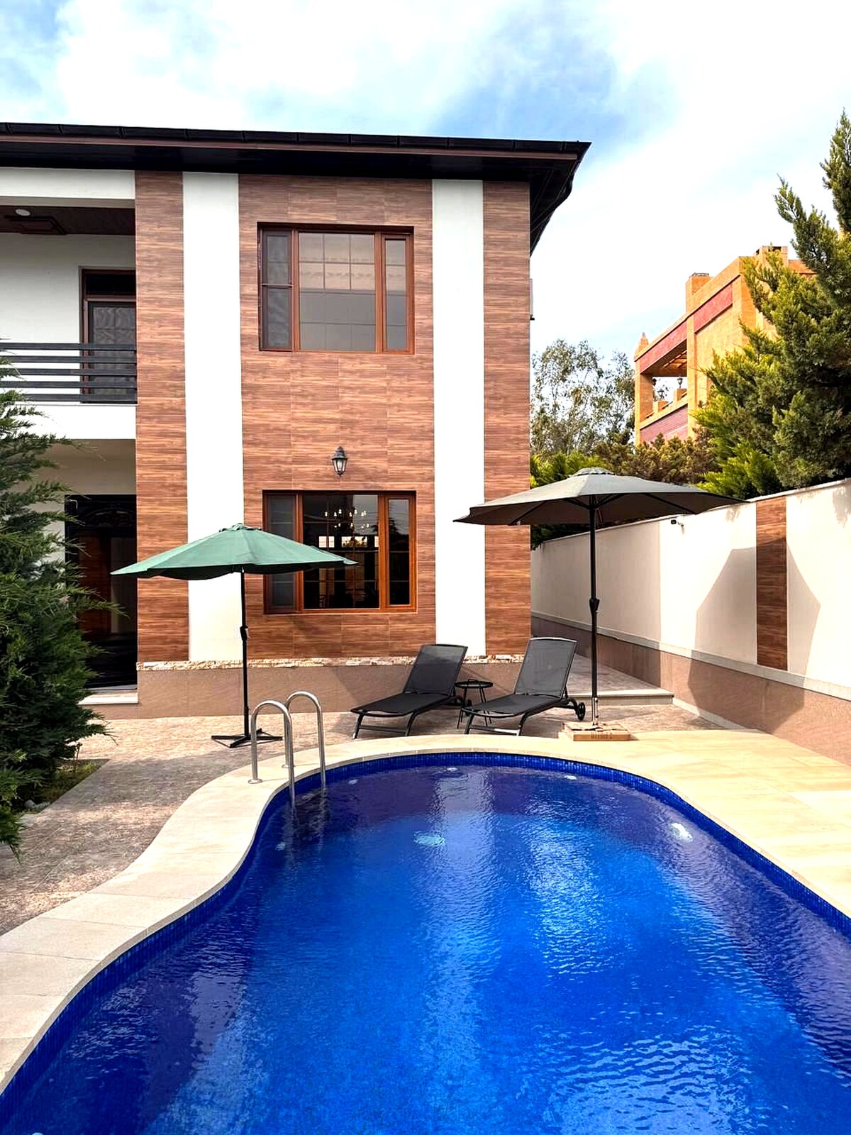 Luxury new villa in a great location, very close to the beach, restaurants, cafes & beach clubs. Located on the main road, 24/7 supermarket & EV charging port across. Panoramic Caspian Sea view. Family-friendly, quiet & clean. Parking for 2 cars. Enjoy outdoor games (dart, frisbee, badminton), indoor games (TV, board games). Fully equipped kitchen & BBQ. Welcome treats: coffee, oranges, charcoal, wine. Next Beauty Salon, our wall-neighbour, offers ladies-only hammam, sauna, gym, beauty services.