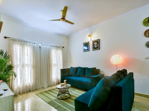 Prostrani apartman od 600 kvadratnih stopa Dizajnerski 1BHK apartman s privatnim balkonom | Brzi Wi-Fi i Smart TV s platformama za streaming, radni/trpezarijski sto, rezervno napajanje 0-24 za nesmetan rad i udobnost |Luxe bračni krevet i ortopedski madrac ,drveni ormari za odlaganje | potpuno opremljena čajna kuhinja | Kauč na razvlačenje u dnevnom boravku , maksimalna popunjenost 4 | Pristup liftu, profesionalno čišćenje i pristup plaćenom pranju veša na licu mjesta za duži boravak| Nalazi se u centralnom Bangaloreu | LGBTQIA++ afirmativno