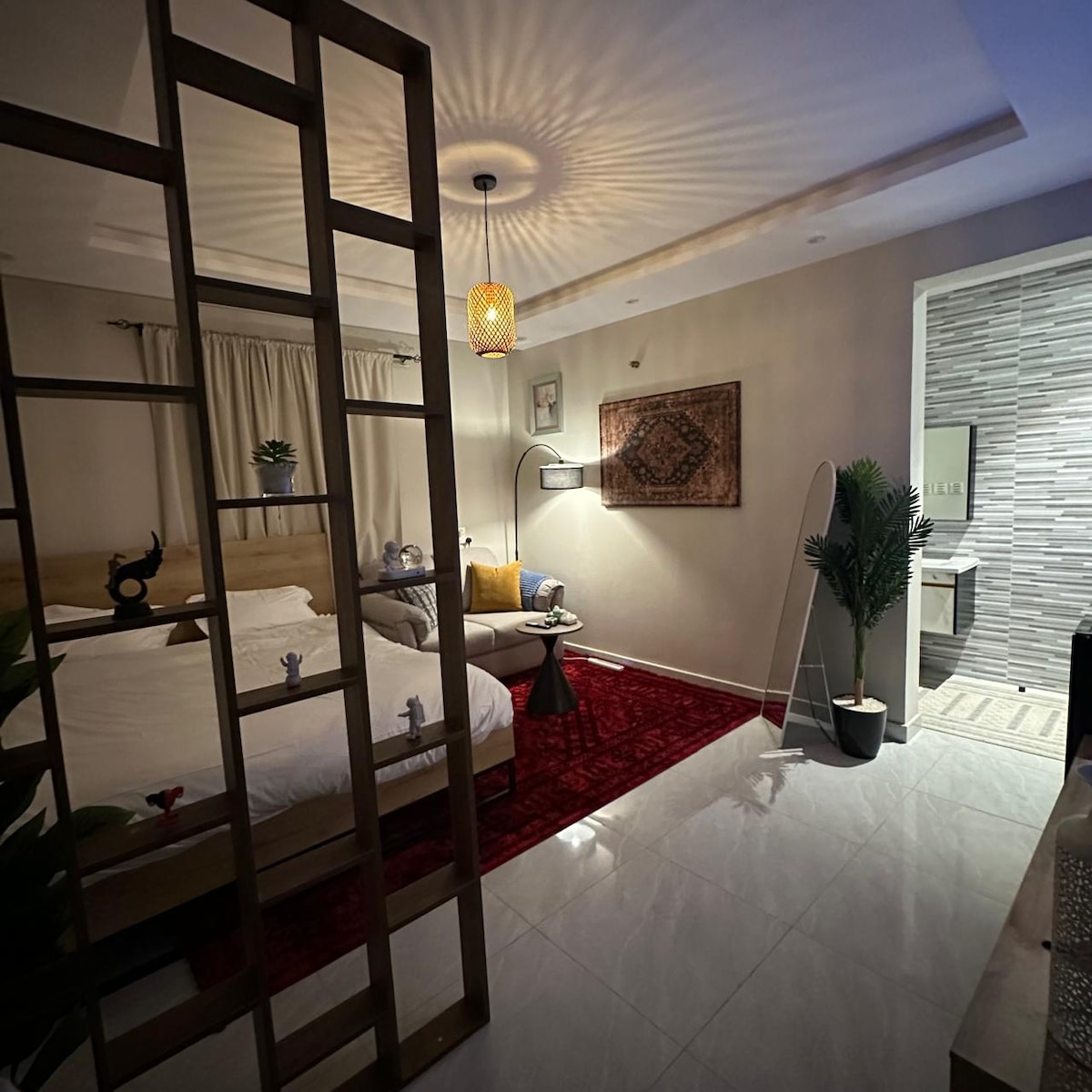 🧡 Topao studio s jedinstvenim i izuzetnim dizajnom koji nudi nezaboravno iskustvo boravka, opremljen najnovijom tehnologijom i električnim uređajima. Kauč koji se pretvara u sjedište za gledanje filmova gleda na 75-inčni ekran, a tu je i topla Jacuzzi kada koja se nalazi u luksuznoj četvrti Al-Nahda na King Roadu, glavnoj arteriji Džede. Živite pored Cornichea, najluksuznijih tržnih centara, restorana, aerodroma i svih usluga. 🏖️🏄🏻♀️🌅