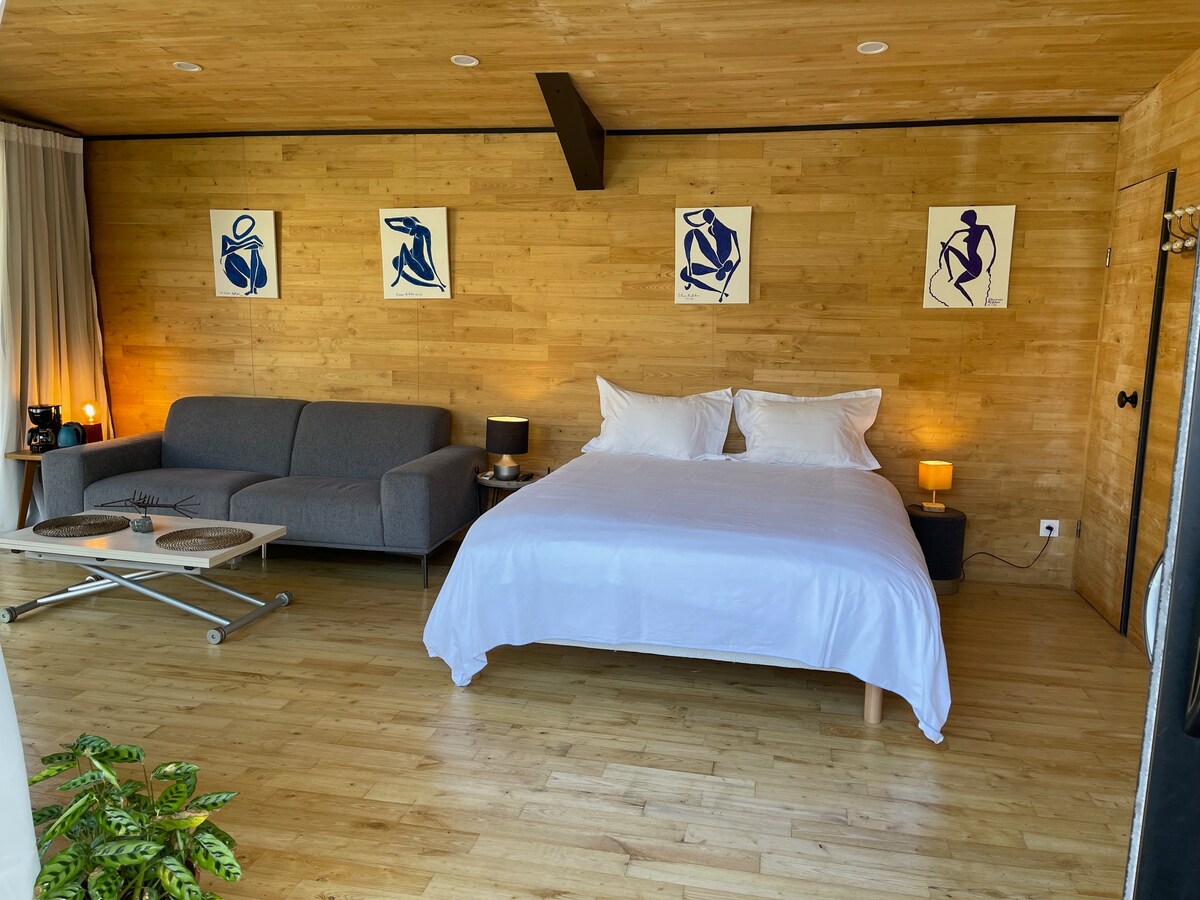 Venez découvrir ce studio unique, entièrement fabriqué en bois, offrant une atmosphère chaleureuse et naturelle. Les murs et le sol en châtaignier apportent une touche élégante et authentique. Situé au cœur d’un jardin verdoyant, ce studio vous invite à la détente. Profitez de l’extérieur sur la terrasse privée, équipée d’une plancha pour vos repas en plein air. NB : vous pouvez louer la piscine, à voir ensemble, selon vos envies.