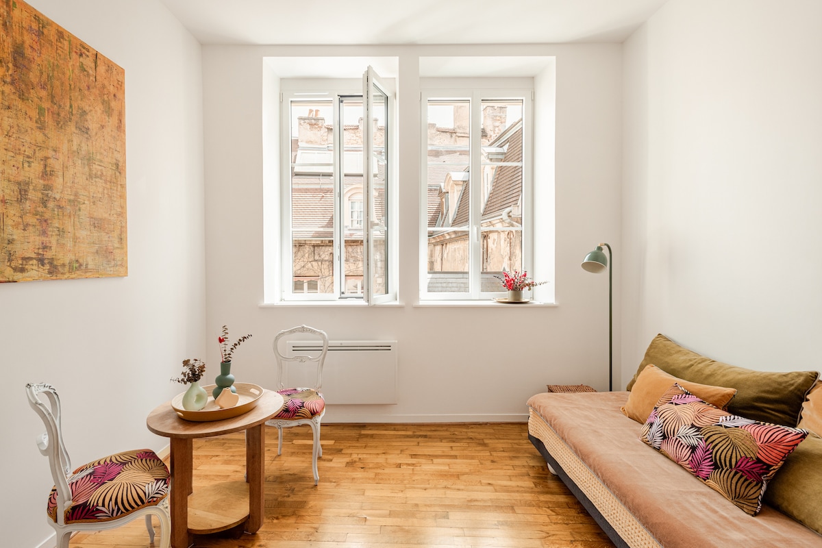 Dobro došli u La Cachette des Ducs, smještaj na krovu u vili iz 17. vijeka, između starih greda, urednog dizajna i pogleda na Tour Philippe Le Bon. Pažljivo renovirana, ova svijetla čahura vam nudi idealno utočište za odmor za dvoje, u mirnom okruženju. Smješten u hiper-centru, ovaj stan vas smješta na nekoliko minuta hoda od Palais Des Ducs, Halles de Dijon, muzeja, Rue de la Liberté i najboljih adresa u gradu. Svuda možete stići pješice.