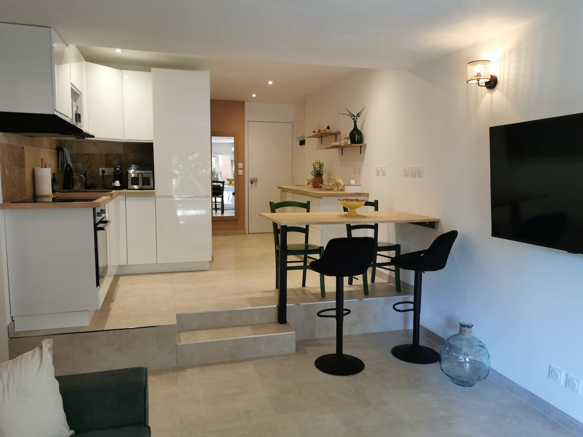 Appart T2, entièrement rénové , très lumineux avec jolie terrasse vue mer, dans résidence avec piscine à 20 mètres de la mer à pieds -1 chambre séparée, draps fournis, lit en 140 cm, TV -SDB avec baignoire, serviettes fournies -WC -entrée avec placard -Cuisine entièrement équipée (micro -ondes, cafetière Senséo, frigo/congélateur, plaque 4 feux, four, grille pain, lave-vaisselle, Lave-linge) - Séjour, couchage canapé rapido 140 cm, TV, WIFI - Terrasse vue mer et montagne avec table et chaises.