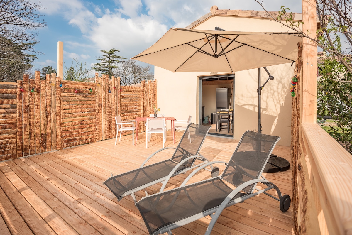 Mala udobna seoska kućica u prizemlju našeg glavnog stana, s nezavisnim ulazom, malim privatnim vrtom i bazenom u kojem naša azijska riba pliva u miru. Ovaj studio od 22 m2 se sastoji od staklenog prozora koji omogućava pristup kuhinji sa svime što vam je potrebno, kupatila s WC-om, tuš kabinom i umivaonikom, kao i spavaće sobe/dnevnog boravka. Idealno mjesto za otkrivanje svih turističkih atrakcija Ardèchea. Stanovnici koje volimo sami dočekati svoje goste.