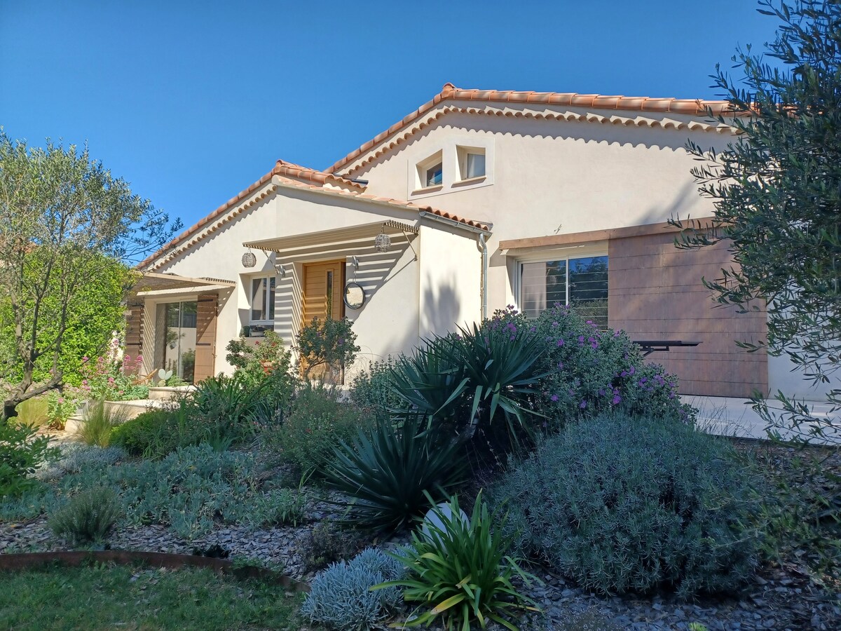 U srcu Occitanie, mirna kuća s odvojenom spavaćom sobom (bračni krevet), kupatilom s italijanskim tušem, svijetlim dnevnim boravkom (kauč na razvlačenje, opremljena kuhinja) i terasom od 20 m2. Besplatan siguran parking. Idealno za praznike, profesionalne boravke, posebno u blizini ADNR centra za obuku u Saint-Laurent-des-Arbresu ili prelazni smještaj. Mogući su kraći boravci od 2 noćenja do dužeg trajanja. 13-30 km od Avignona, Orangea, Nîmesa, Uzèsa, Pont du Gard, Châteauneuf-du-Pape.