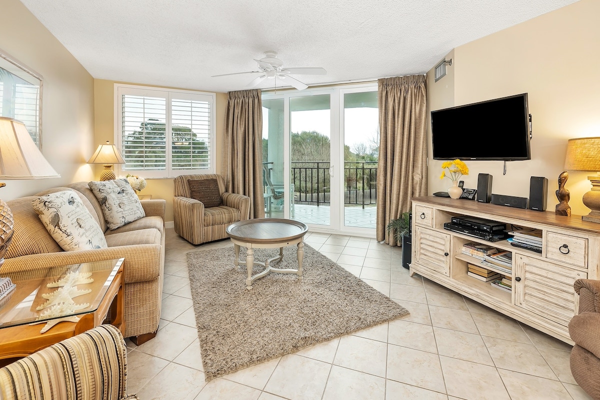 Comfort, relaxation, and beauty await you here - On the quieter and most private side of the Beach Club - with direct, gated beach access . Enjoy our oceanside saltwater pool, 2 hot tubs, and lush gardens - in the perfect spot, on one of the prettiest beaches in the South! Primary suite with king bed, walk-in shower/soaking tub. Second bedroom with 1 queen/ 1 twin, full bathroom. Well-equipped kitchen, full balcony... Come on, the dolphins are waiting for you!