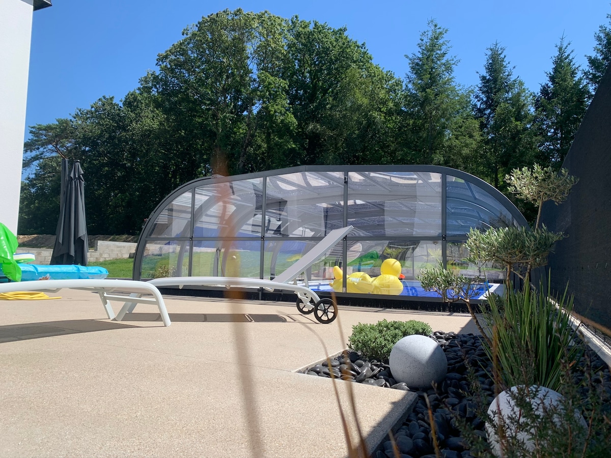 Nova kuća na jednom spratu 110 m² - privatni bazen 8x4 grijan (april - oktobar ) prekriven skloništem na izvlačenje i plažom za sunčanje unutar - spa centar sa 6 sjedišta - velika terasa sa sunčalištem, vrtni sto na 1000 m² mirno i opuštajuće zemljište s južnim pogledom na besprijekornu šumu. Prostrana dnevna soba, dnevna soba, kuhinja površine 50 m² . Nalazi se u Le Trévoux 20 minuta od plaža Clohars-Carnoet ili Nevez, 10 minuta od Pont Avena. ( Poštujte mir mjesta)