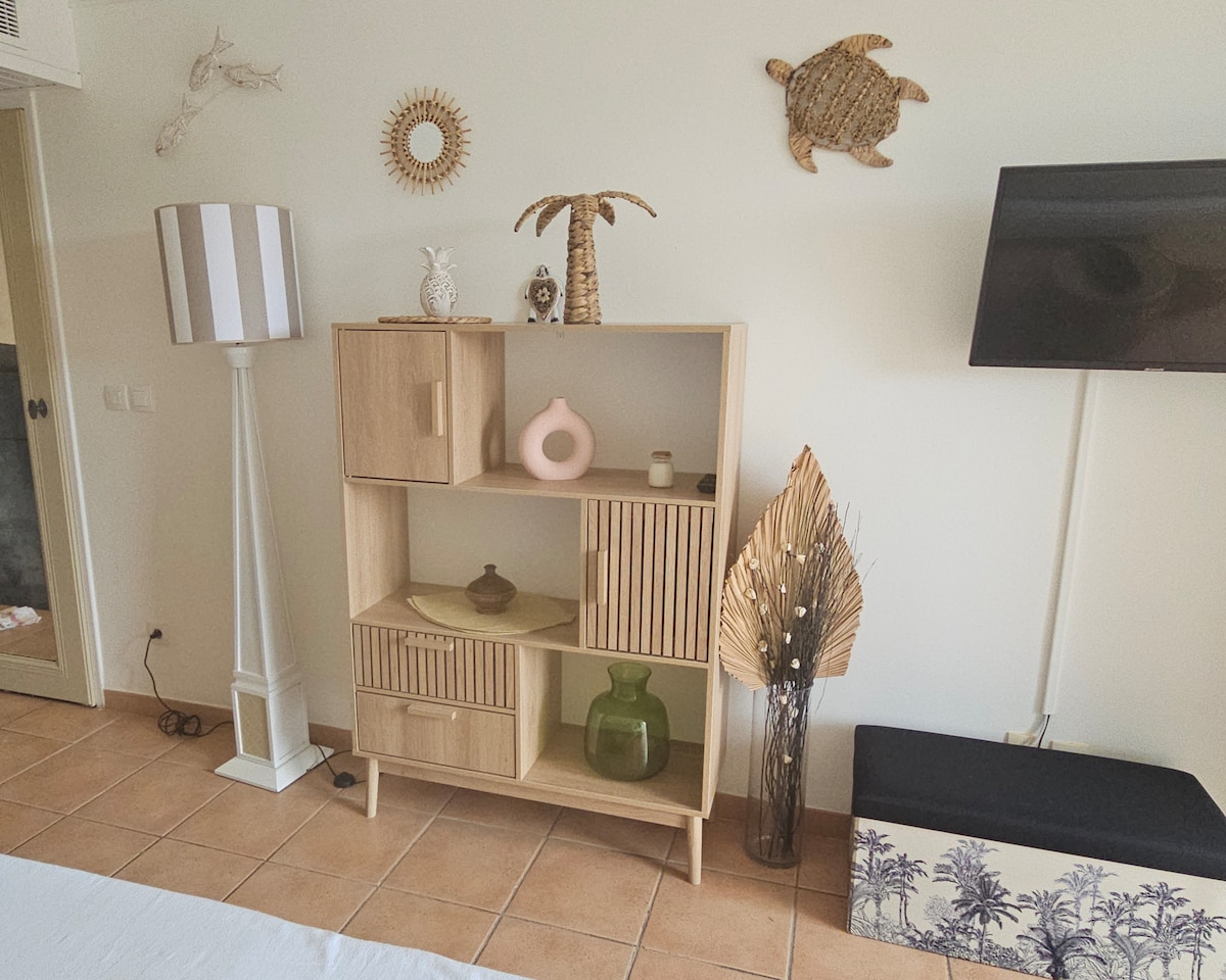 Ovo je veliki studio od oko 24 m² koji se otvara na natkrivenu vanjsku terasu od 11 m², koja služi kao glavni dnevni boravak smještaja zahvaljujući trpezariji, čajnoj kuhinji i izuzetnom pogledu na vrt i more. Raspored kreveta (3): Izbor: 1 vrlo veliki krevet (L160) ili 2 odvojena kreveta za jednu osobu (2xL90) + 1 krevet za jednu osobu od L90.