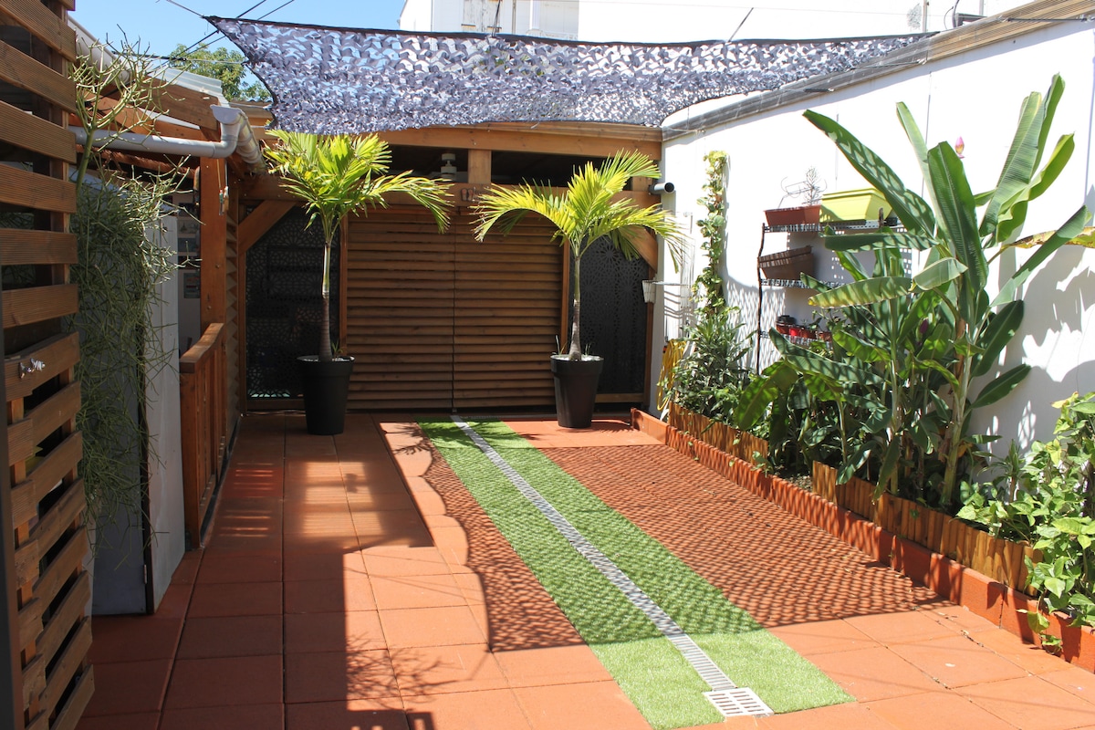 Ovaj mirni, potpuno opremljeni smještaj nudi opuštajući boravak s porodicom ili za 4 osobe. Na nivou vrta i bez ikakvog pogleda, možete uživati u jacuzziju i velikoj terasi od 35 m2 s prekrasnim pogledom na Saint Denis. Također ćete imati pristup našem bazenu (bez grijanja), vrijeme određeno po dolasku. Idealno smješteni Colline des Camélias, bit ćete u blizini lokalnih prodavnica, 10 minuta od centra grada i 10 km od aerodroma.