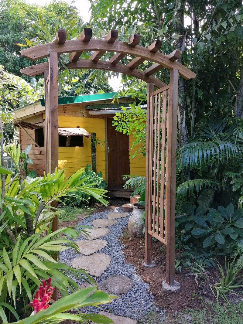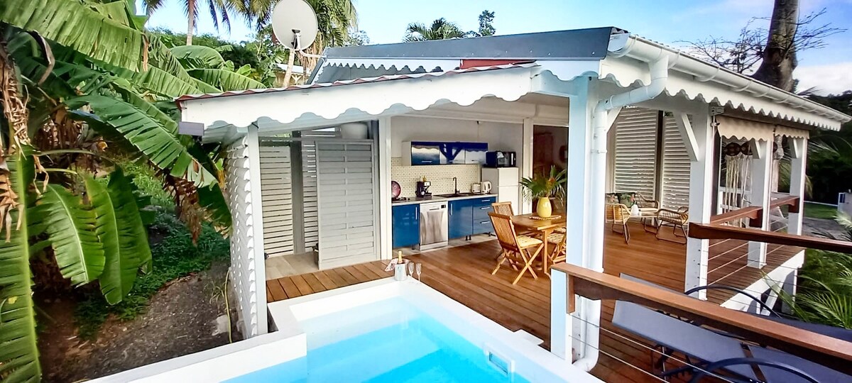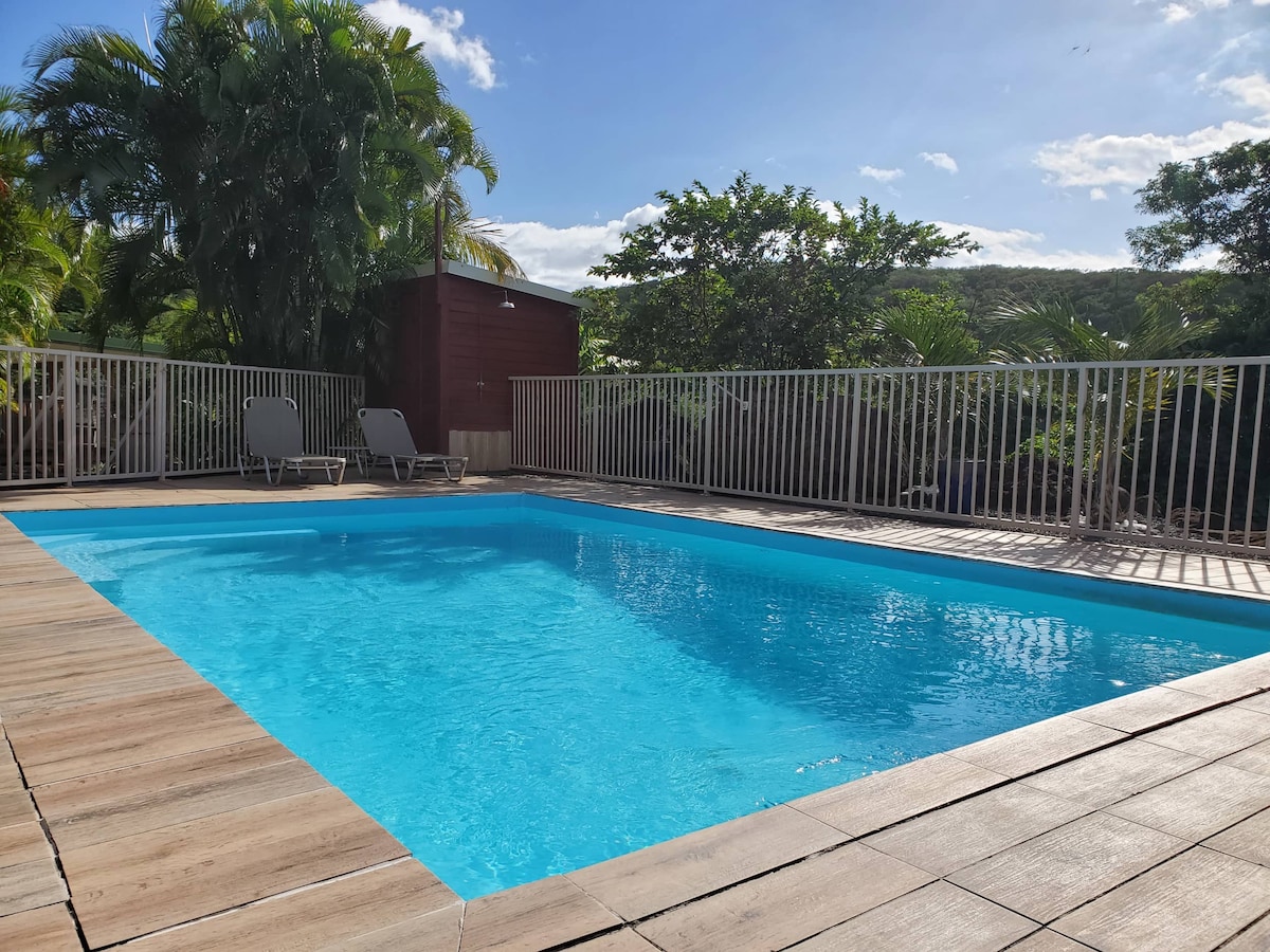 In a setting of tropical vegetation, our small family structure is made up of three independent wooden bungalows around a large salt pool. Depending on the season, you can enjoy the many flowers and fruits in our garden. We are located on the heights of Deshaies, 50 meters from the Botanical Garden. Breakfast in supplement is served on reservation and in complete privacy on your terrace.