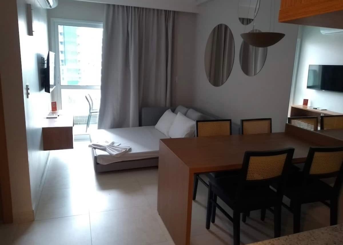 Aproveite o espaço elegante com toda a sua família! Apartamento de 30 m² com cozinha e sala integradas, sala com sofá cama, Smart TV 40 polegadas, ar condicionado e varanda, cozinha com balcão e banquetas, micro-ondas, frigobar e louças básicas. Quarto com cama de casal, Smart TV 40 polegadas e ar. Os apartamentos possuem banheiro e roupa de cama completa. O acesso Wi-Fi gratuito está disponível no apartamento e nas áreas públicas. Ocupação máxima: 4 adultos.
