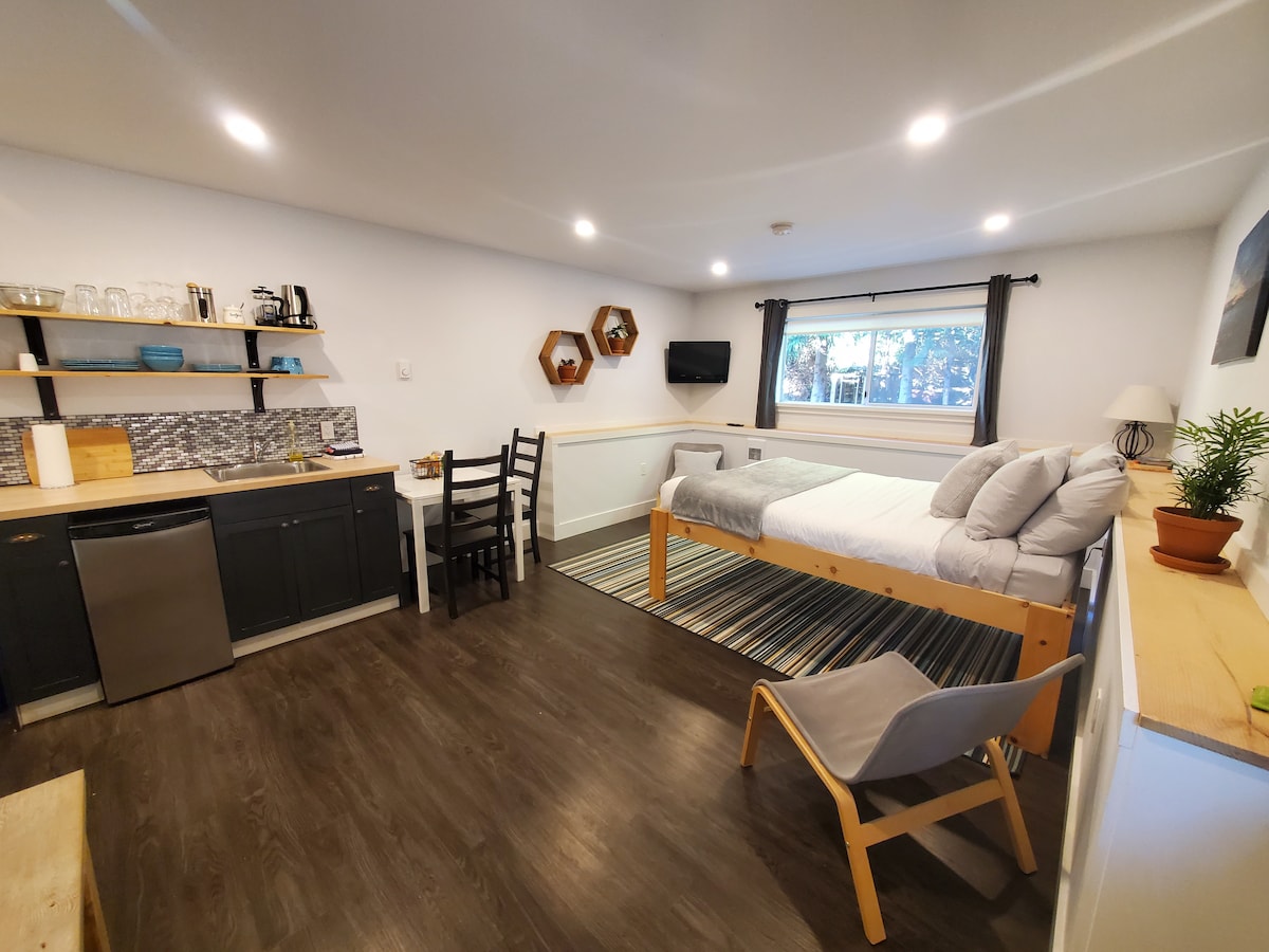 Dobro došli u apartman za goste Doug Fir! Koraci od stjenovite osamljene plaže i samo nekoliko minuta hoda od staze Wild Pacific Trail nalazi se ovo potpuno novo utočište u novoizgrađenom domu koji se nalazi na kraju poluostrva Ucluelet u mirnoj slijepoj ulici. Uživajte u zvuku valova koji udaraju iz kreveta. Apartman s 1 spavaćom sobom i tuš kabinom s padavinama, bračnim krevetom, pametnim TV-om i čajnom kuhinjom. Napomena: Vlasnici, njihovo 3-godišnje dijete i vrlo ljubazan pas žive na spratu, tako da se može očekivati malo buke.