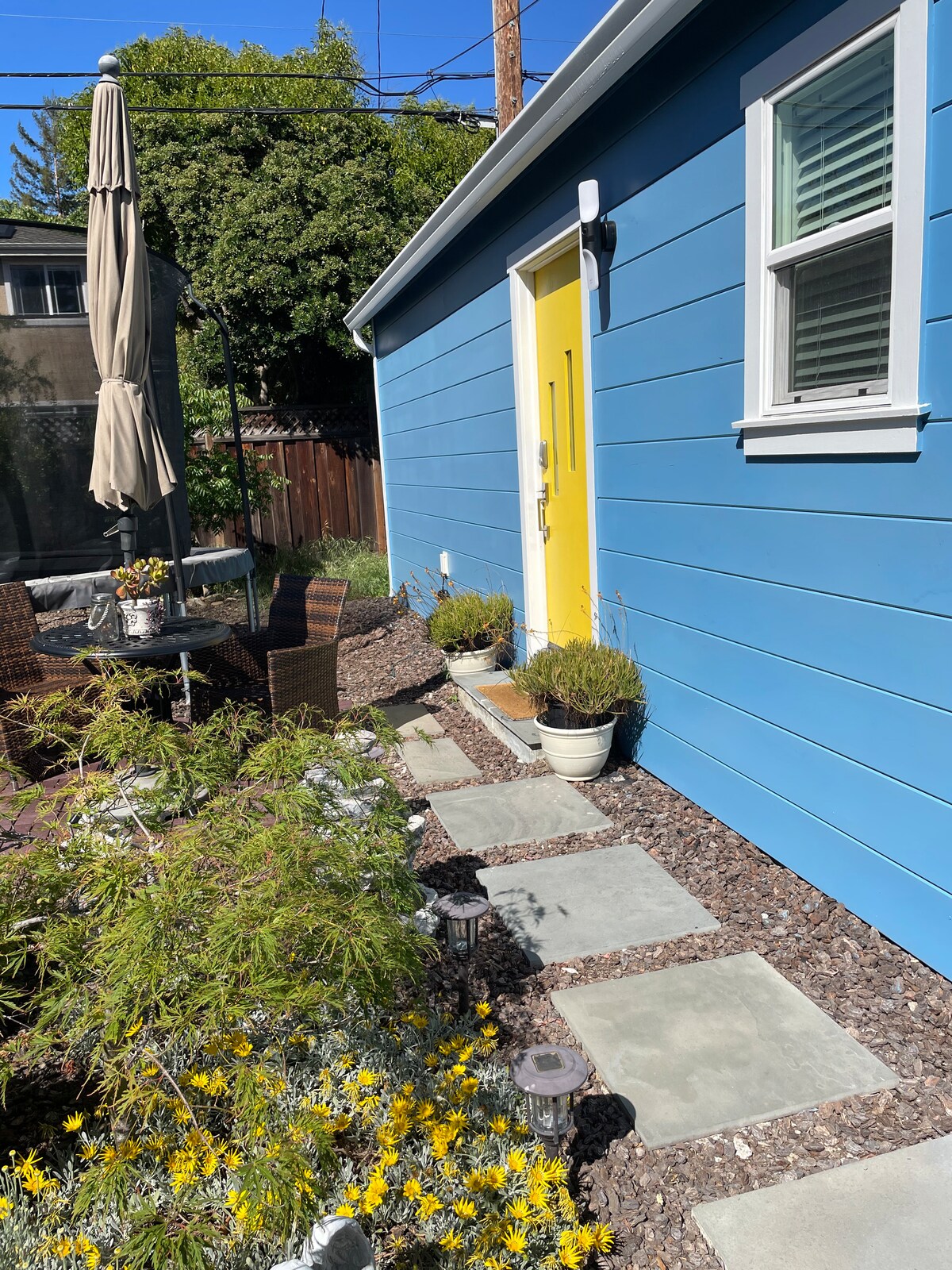 Experience elegance and comfort in our spacious, 500 sq ft studio cottage, located in the heart of Silicon Valley. Newly built in a classic Craftsman style, it features wooden casement windows, a private garden with Adirondack chairs, and a fully-equipped kitchen with an Italian range. Enjoy a plush queen-sized bed, a cozy sectional for cinema-like experiences on a 65" TV with in-ceiling speakers, and lightning-fast Wi-Fi. Perfect for a luxurious and memorable stay.