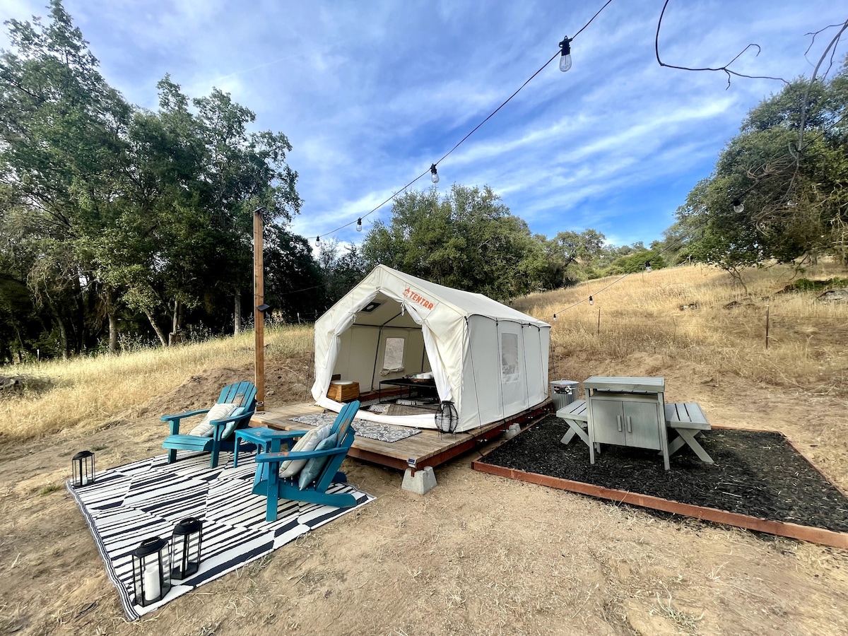 Dođite i doživite vrhunsko luksuzno kampovanje! Smješten među hrastovima, s pogledom na dolinu i brda samo 28 minuta od parka Kings Canyon NP, naš kamp ima vrhunski krevet Tuft-and-Needle, vanjsku kuhinju, anti-gravitacijske stolice, isparivački hladnjak za one vruće ljetne noći, luksuzni tuš i prekrasan pogled. Osjetite miris prirodne cedrovine i uživajte u pogledu na zvijezde dok koristite naš tuš bez krova. Roštiljajte nešto posebno nakon dana provedenog u parku, slušajte ptice i opustite se!