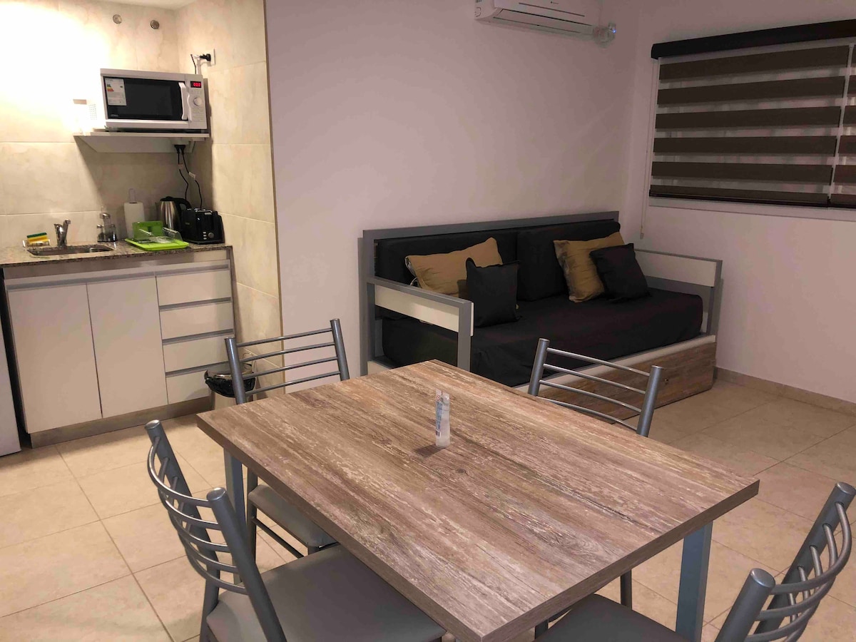 11 potpuno opremljenih stanova za 4 gosta i 1 soba za osobe s invaliditetom (2 gosta). Privatne garaže. Roštilji sa stolom i stolicama. Mjesto s integrisanim jacuzzijem, ležaljkama, zelenim površinama, kamerama u cijelom stanu, alarmom u svakom stanu. Pogodno za kontingente sportista, događaje, kongrese, kurseve itd. 2 bloka od Av Circunvalacióna, supermarketa, apoteka, restorana u blizini. 20 blokova od centra grada. Lijepo i sigurno!!! I vrlo tiho