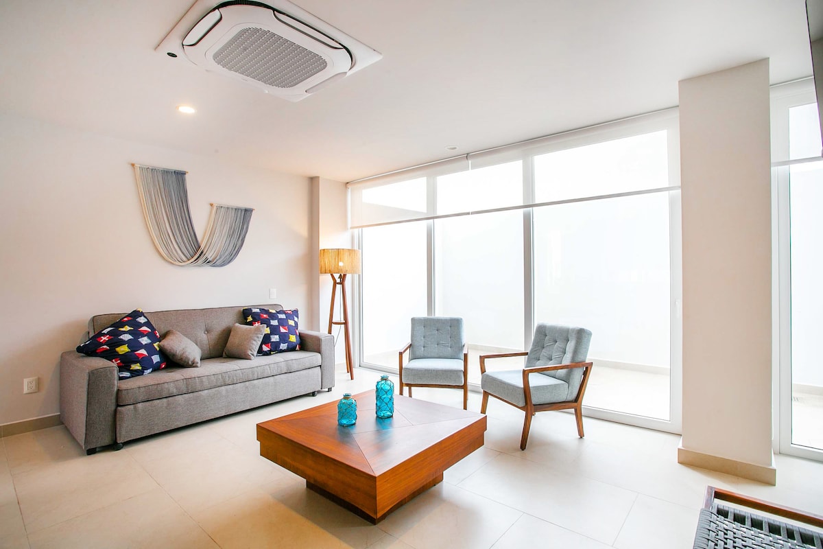 Jednosoban stan u kondominijima Paviljona (Zona Romantica), 2 bloka od plaže Los Muertos, u blizini restorana, barova, klubova i javnog prevoza. Tu su bazeni na krovu, jacuzzi i teretana. Jedinica ima Wi-Fi i pametni TV (još nema kablovsku), mašinu za pranje veša, sušilicu i potpuno opremljenu kuhinju. Postoji balkon okrenut prema unutrašnjem dvorištu. Vikendom je buka iz kluba iza zgrade, jedinica je na trećem spratu, ali imate buku, prirodno svjetlo je ograničeno jer se suočava s unutrašnjim dvorištem.