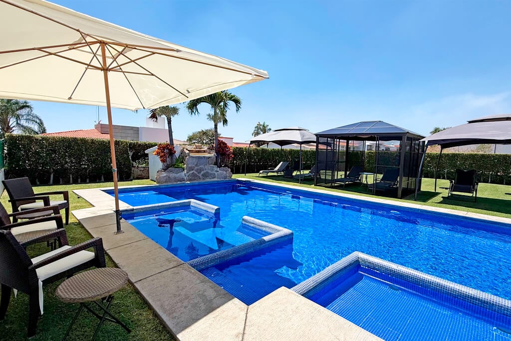 Hermosa casa en Lomas de Cocoyoc cómoda , amplia excelente ubicación 5 habitaciones cada una con baño completo y dos de ellas con aire acondicionado., amplio jardín con jacuzzi, alberca (costo de la calefacción adicional) , área de asador Weber con gas y refrigerador. Sky en 2 pantallas y xbox Terraza con amplio comedor y una muy confortable sala para descansar, tomar un desayuno o pasar una agradable velada. Cuenta con buffer Bluetooth para amenizar el área