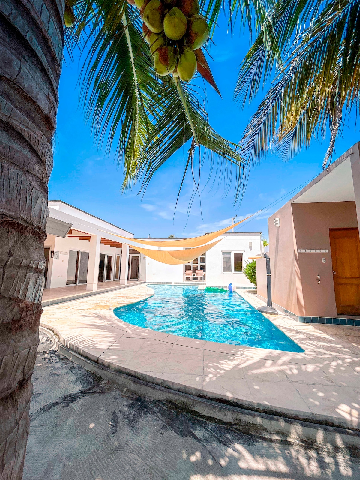 Con tu familia crea recuerdos inolvidables en esta casa en condominio seguro, con cocina moderna completamente equipada. Piscina privada grande con diferentes alturas para todas las edades, y múltiples sombrillas para tener sombra en la piscina. Acceso privado a la playa. Mesa de Ping-Pong, Juegos de niños y jardín de 500 metros para juegos al aire libre. Duerme cómodamente en 5 habitaciones con aire y TV, 16 camas en total. Parqueo para 4 carros dentro de la propiedad, más parqueos de visita.