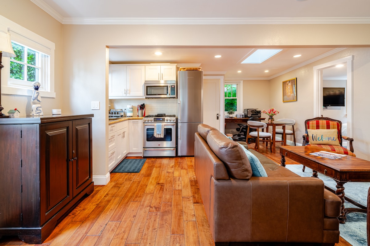 Doživite eleganciju i udobnost u našoj prostranoj studio seoskoj kućici od 150 kvadratnih metara, koja se nalazi u srcu Silicijske doline. Novoizgrađen u klasičnom stilu zanatlije, ima drvene prozore, privatni vrt sa stolicama Adirondack i potpuno opremljenu kuhinju s italijanskim asortimanom. Uživajte u plišanom bračnom krevetu, udobnom odjeljku za doživljaje poput kina na TV-u od 65"s zvučnicima u plafonu i munjevitom brzom Wi-Fi mreži. Savršeno za luksuzan i nezaboravan boravak.